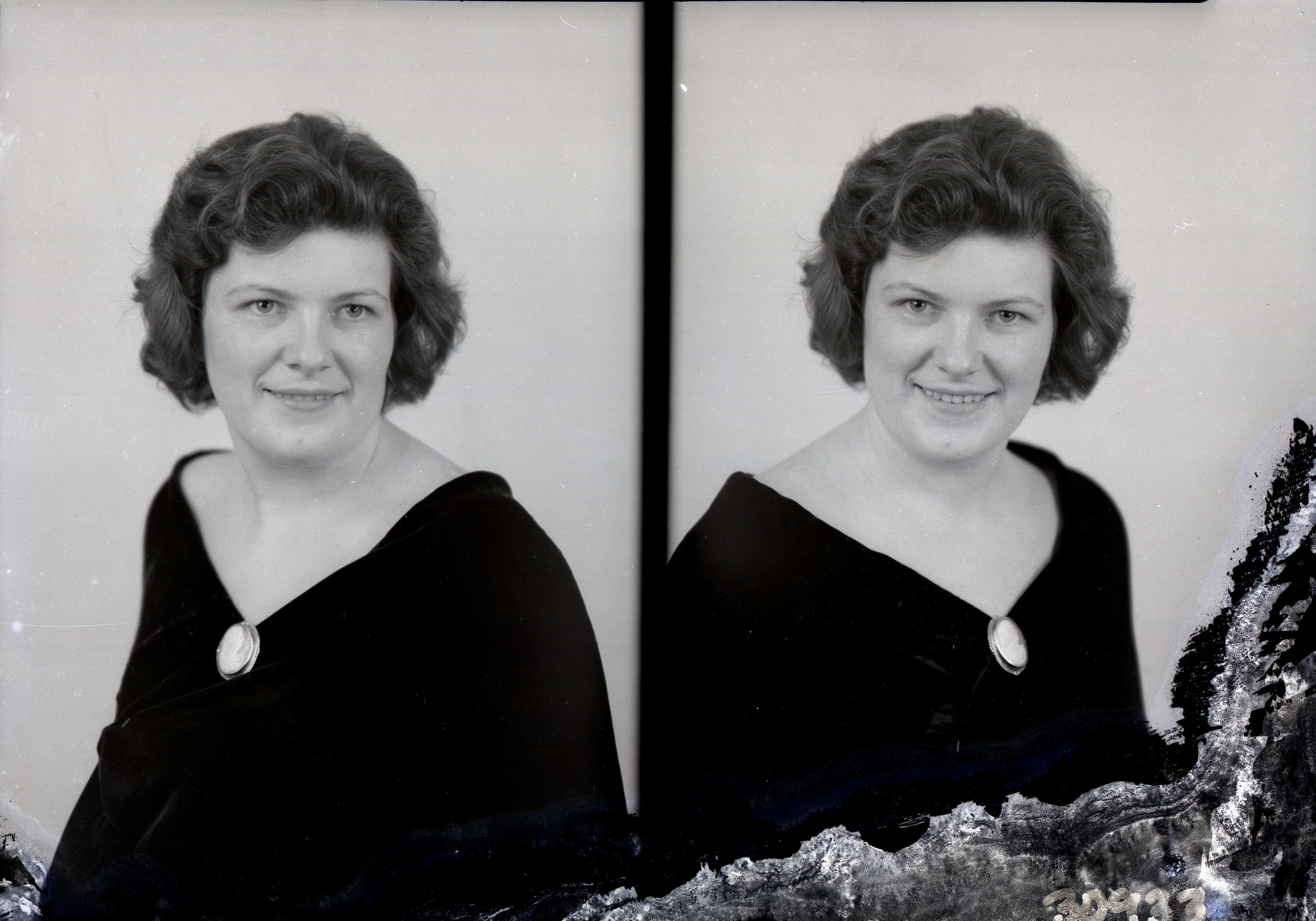 Photo of two separate portrait photographs of the same unidentified young woman with short hair and wearing a cameo pin on the front of her dress.