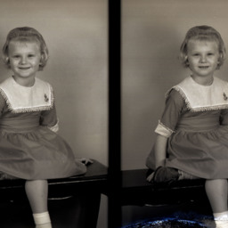 Photo of two separate photographs of the same unidentified young girl with short hair and seated on a bench with one leg under the other.