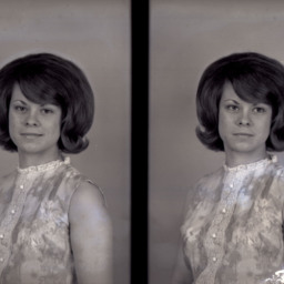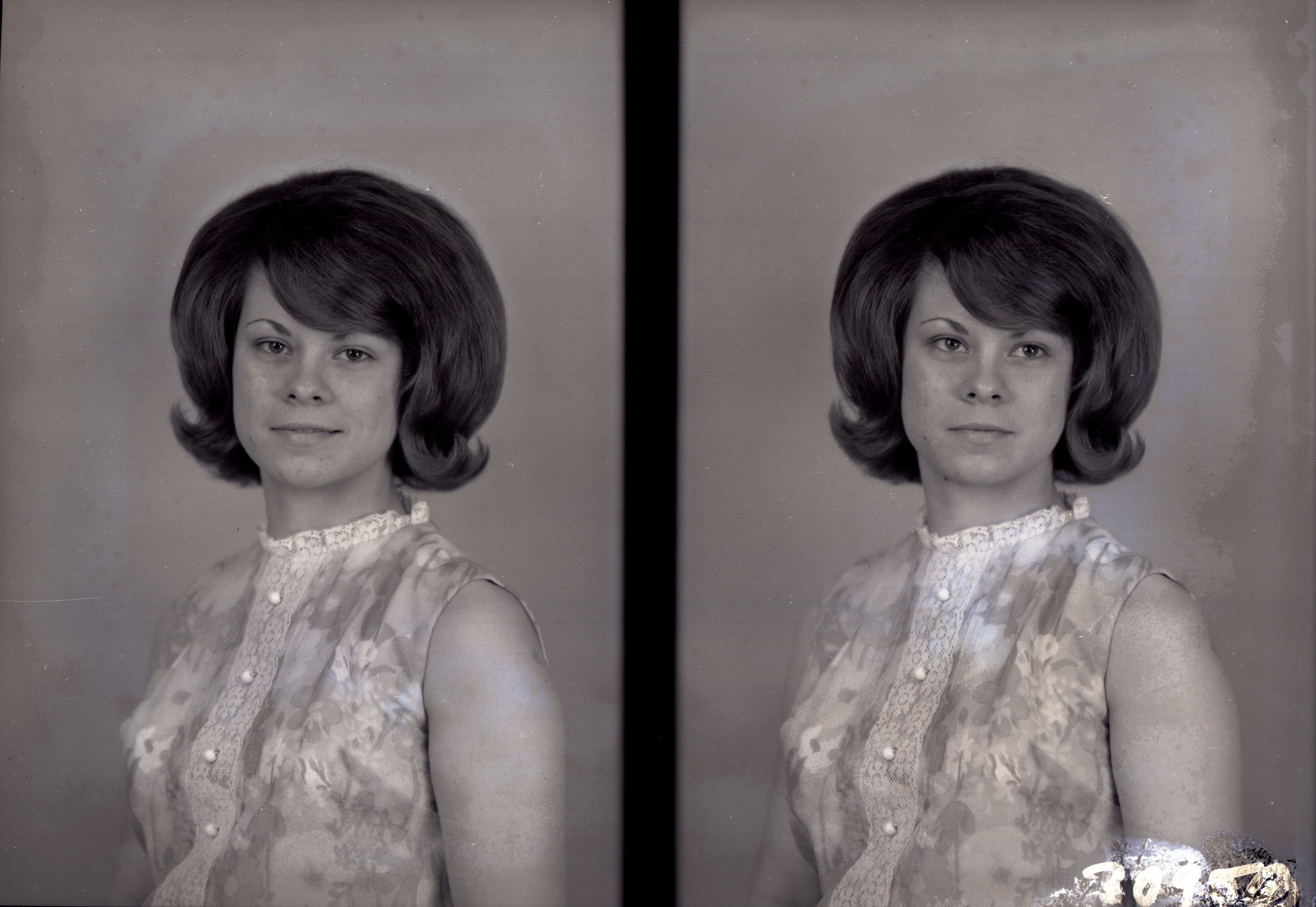 Photo of two separate portrait photographs of the same unidentified woman with short hair curled outwards and wearing a sleeveless blouse.