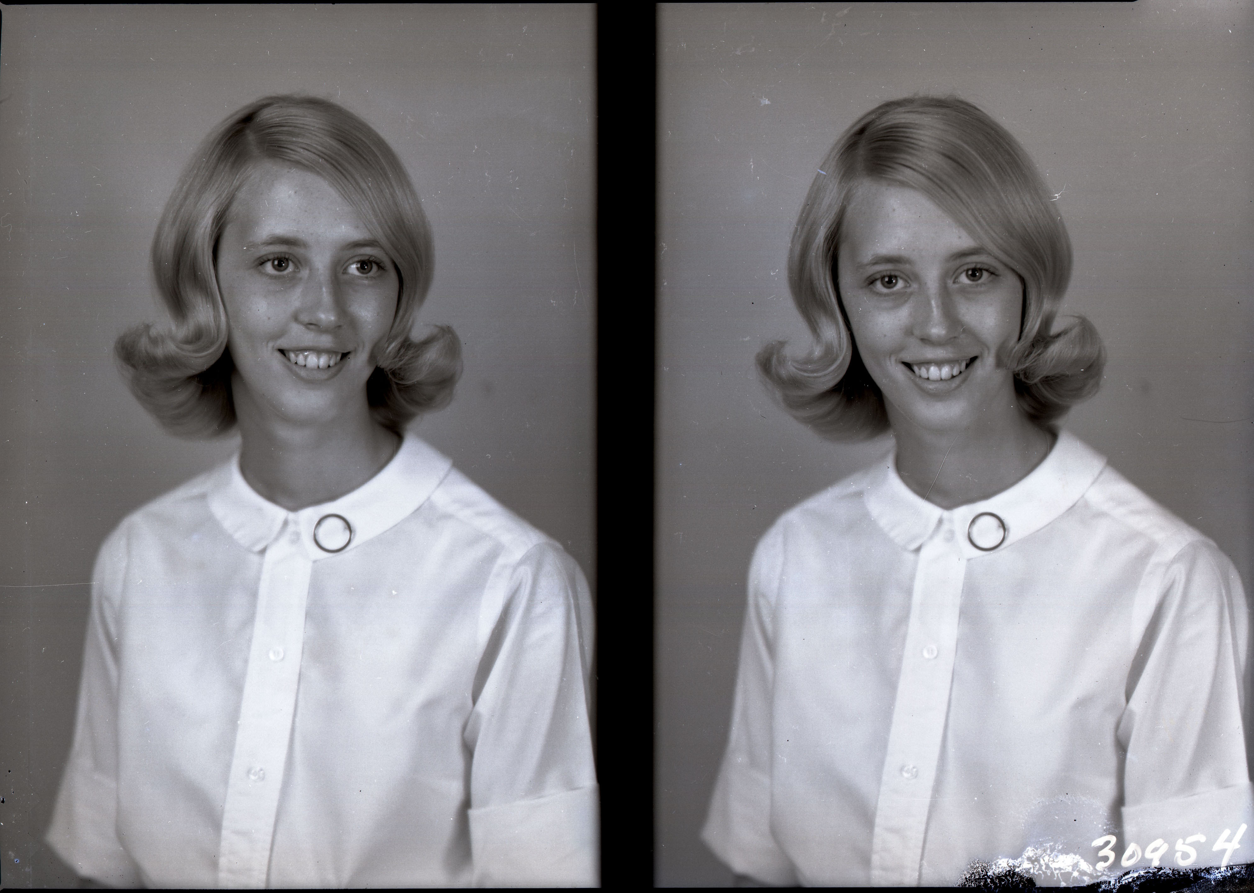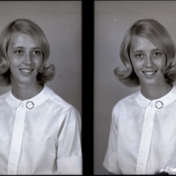 Photo of two separate portrait photographs of the same unidentified young woman with short blond hair curled outwards and wearing a pin on the collar of her blouse.
