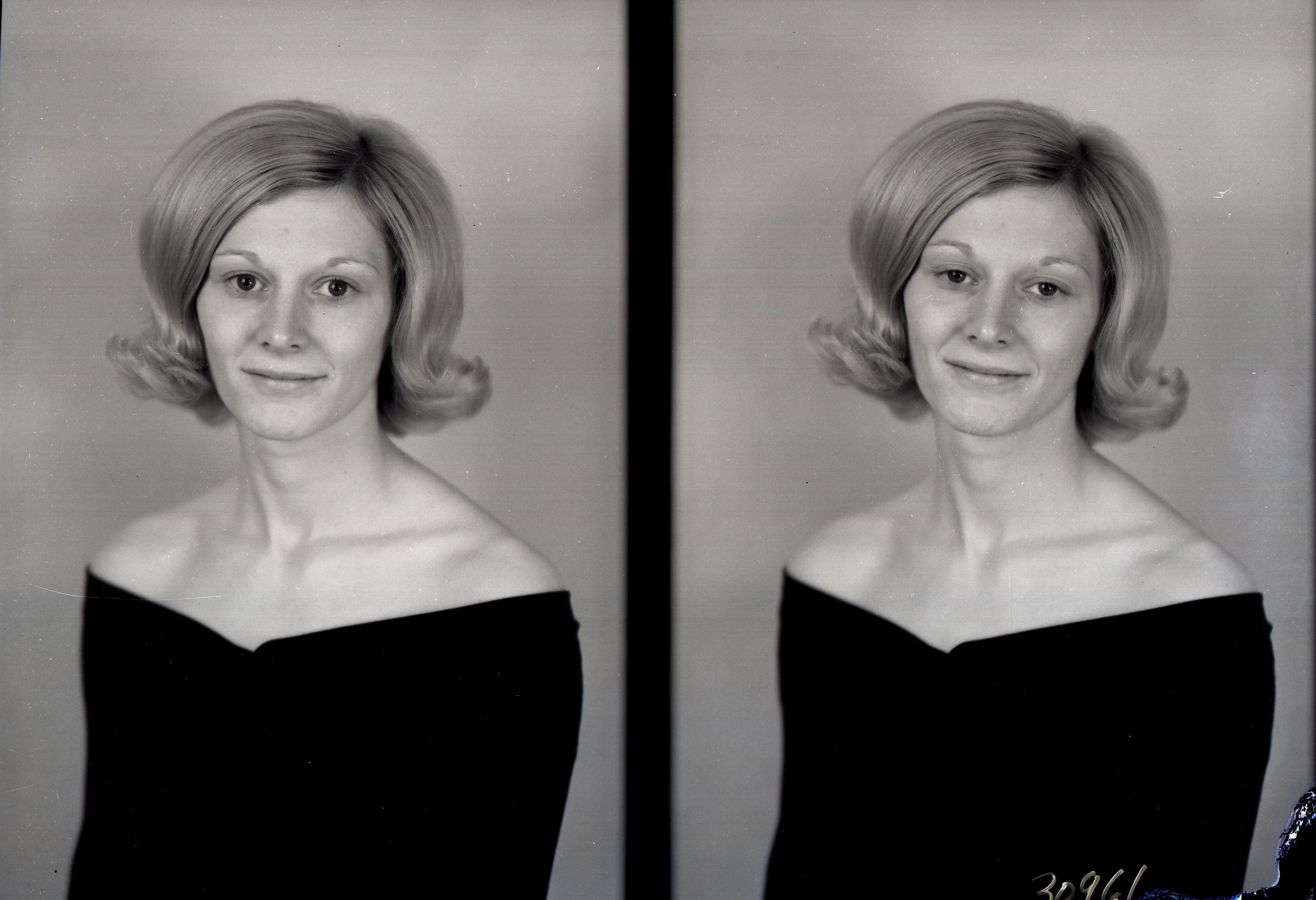 Photo of two separate photographs of the same unidentified young woman with short blond hair curled outwards.