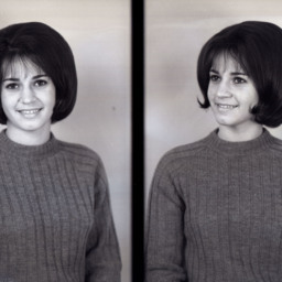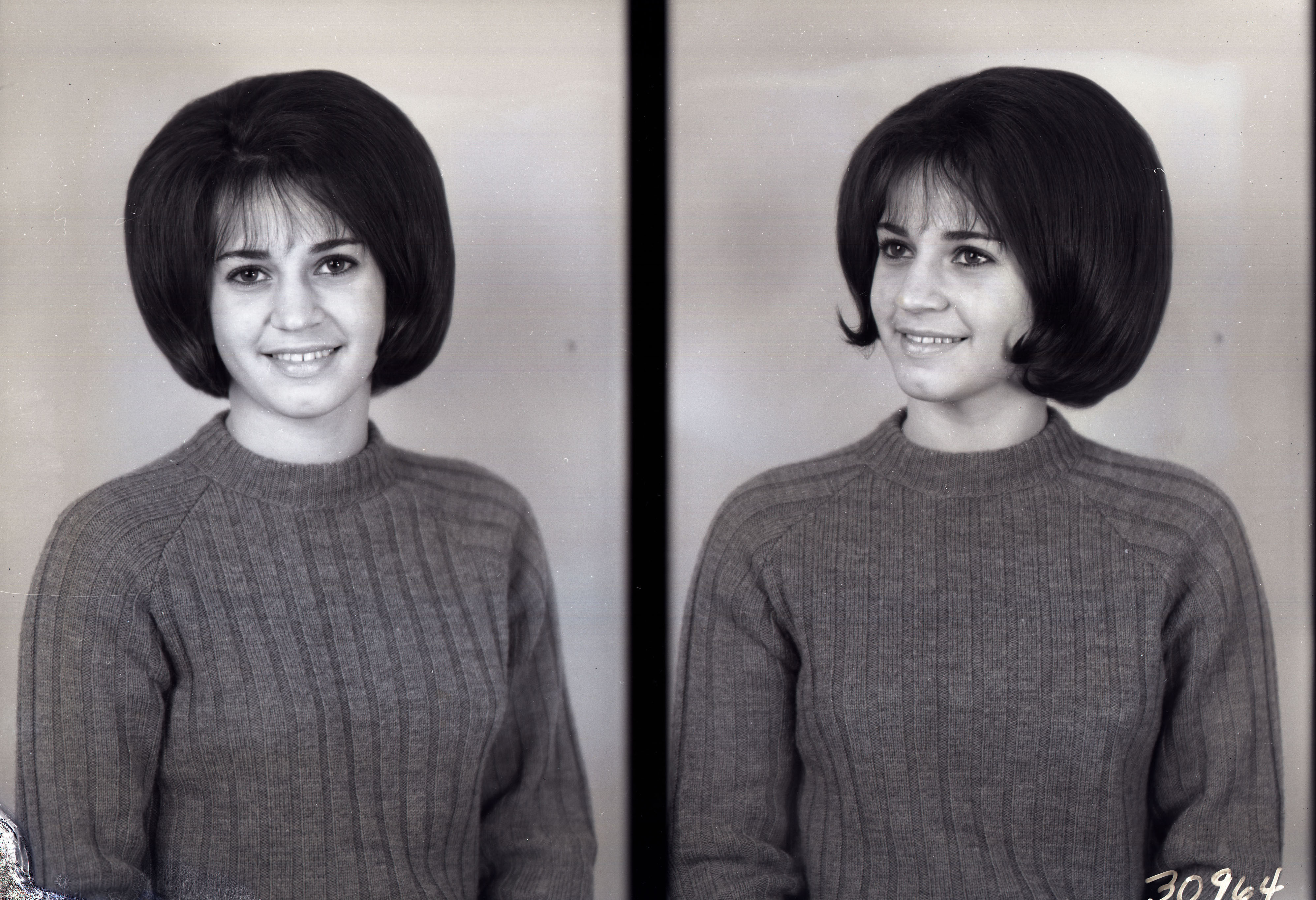 Photo of two separate portrait photographs of the same unidentified woman with short styled hair and wearing a sweater.