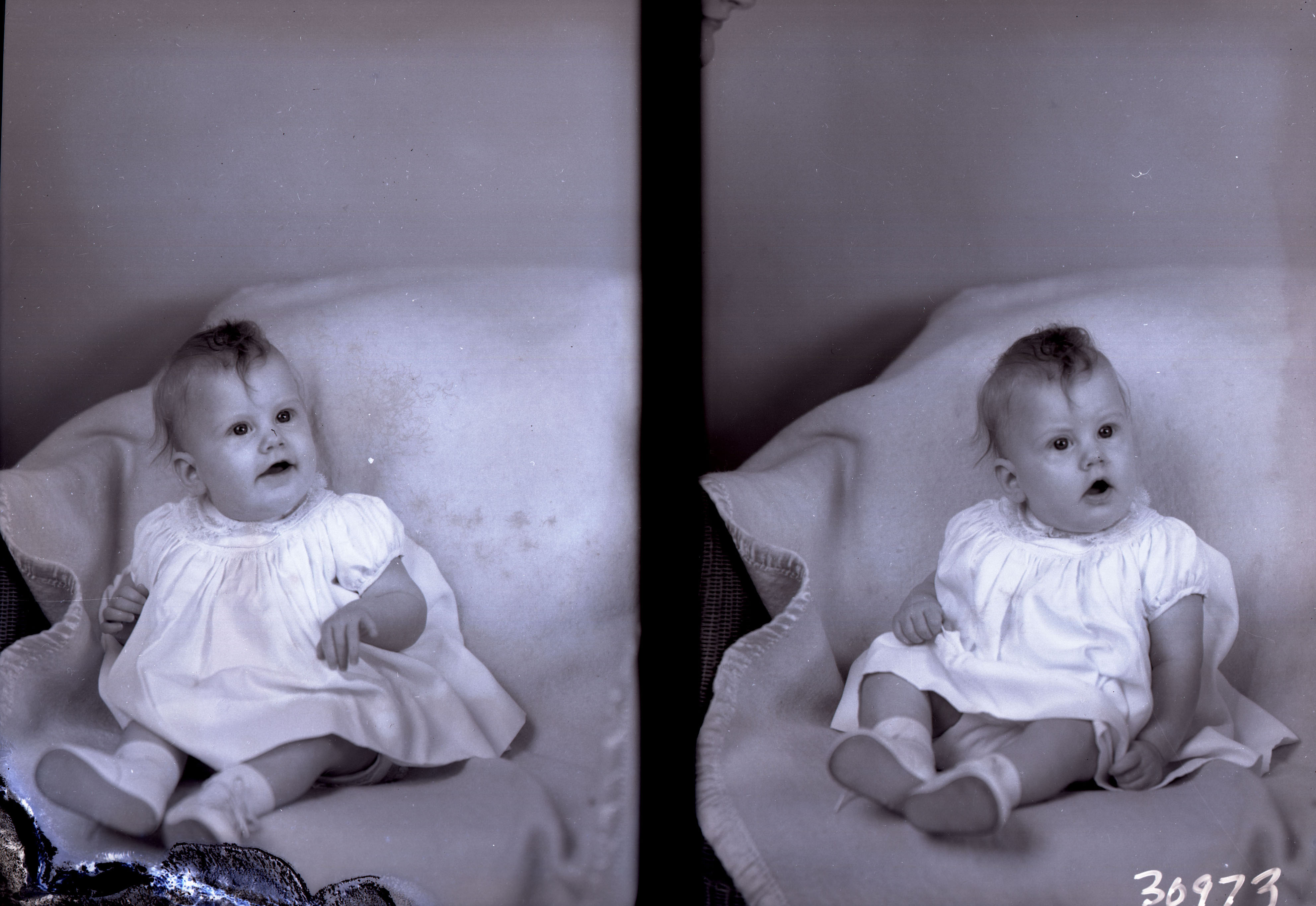 Photo of two separate photographs of the same unidentified young child seated on a covered chair.