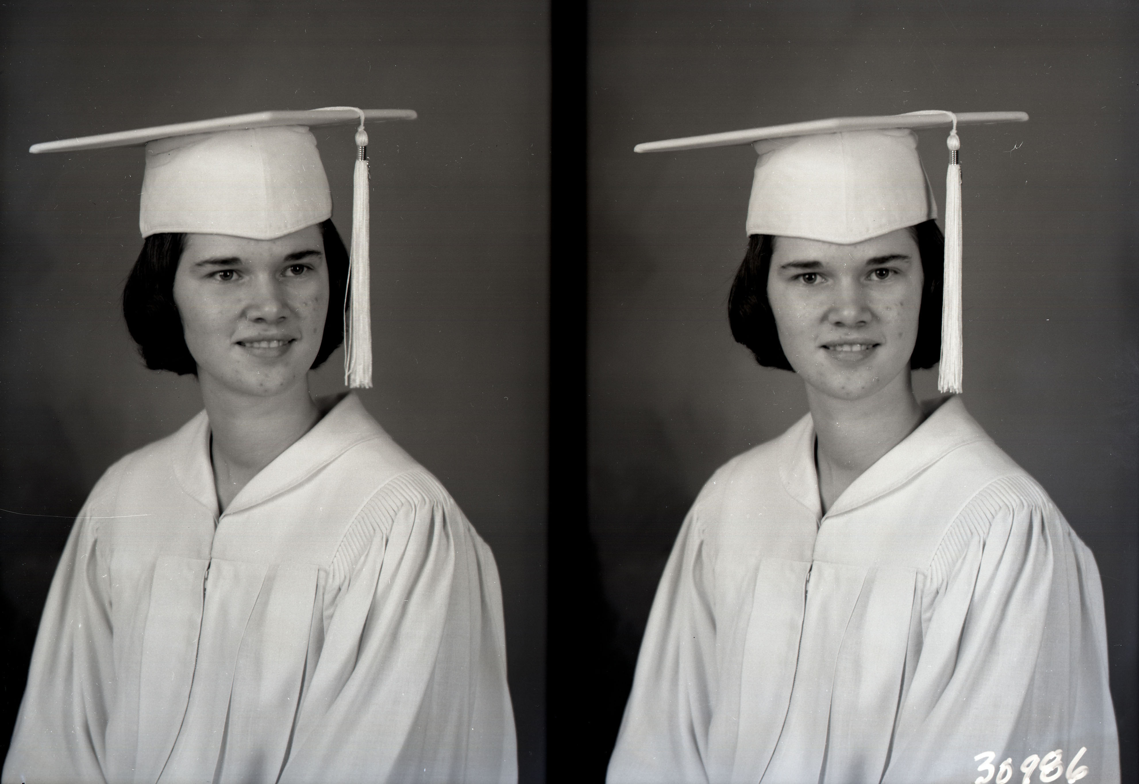 Photo of two separate portrait photographs of Jennie (Foltz) Miller wearing a graduation cap and gown.