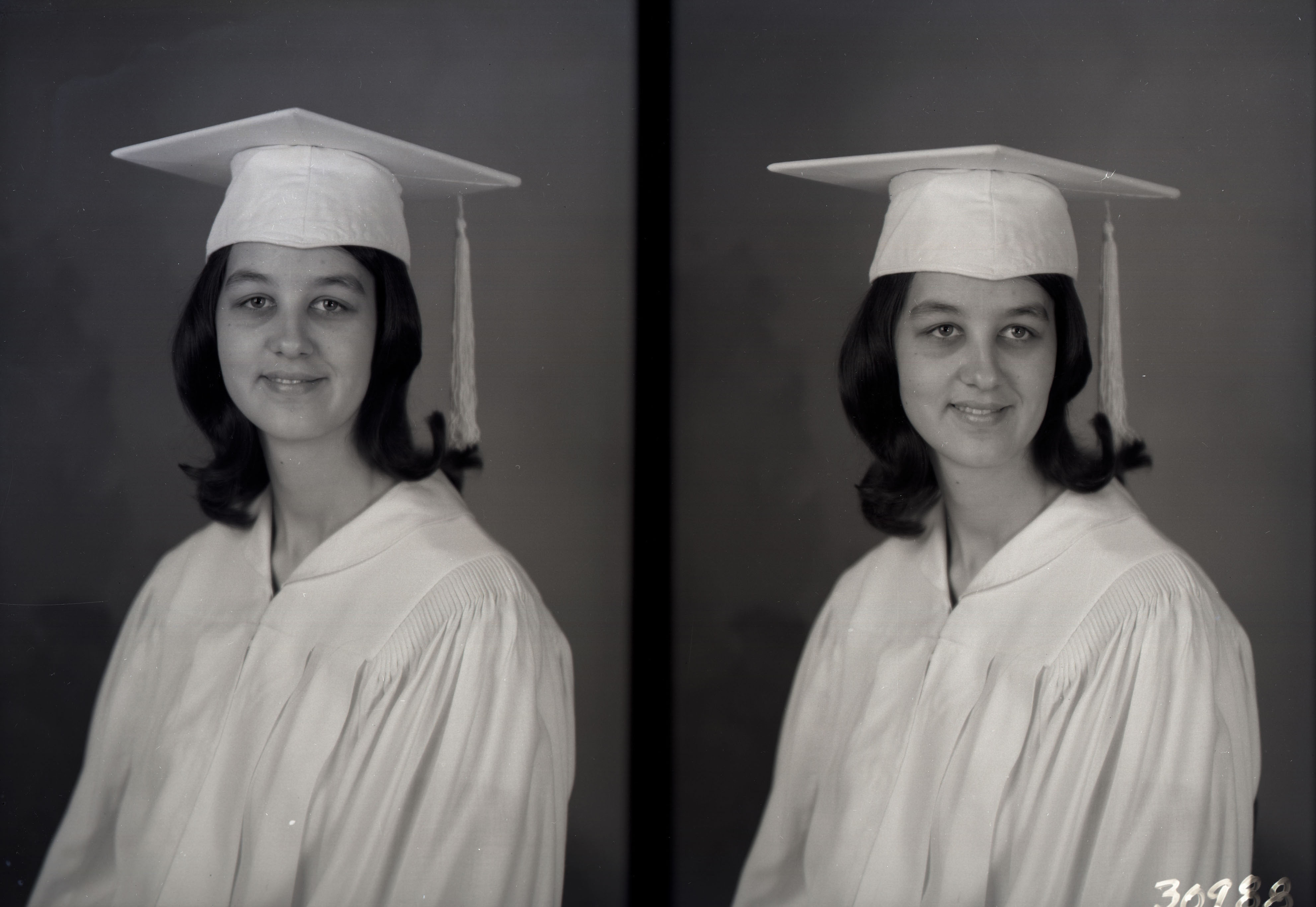 Photo of two separate portrait photographs of the same unidentified young woman with shoulder-length hair curled outwards and wearing her graduation cap and gown.