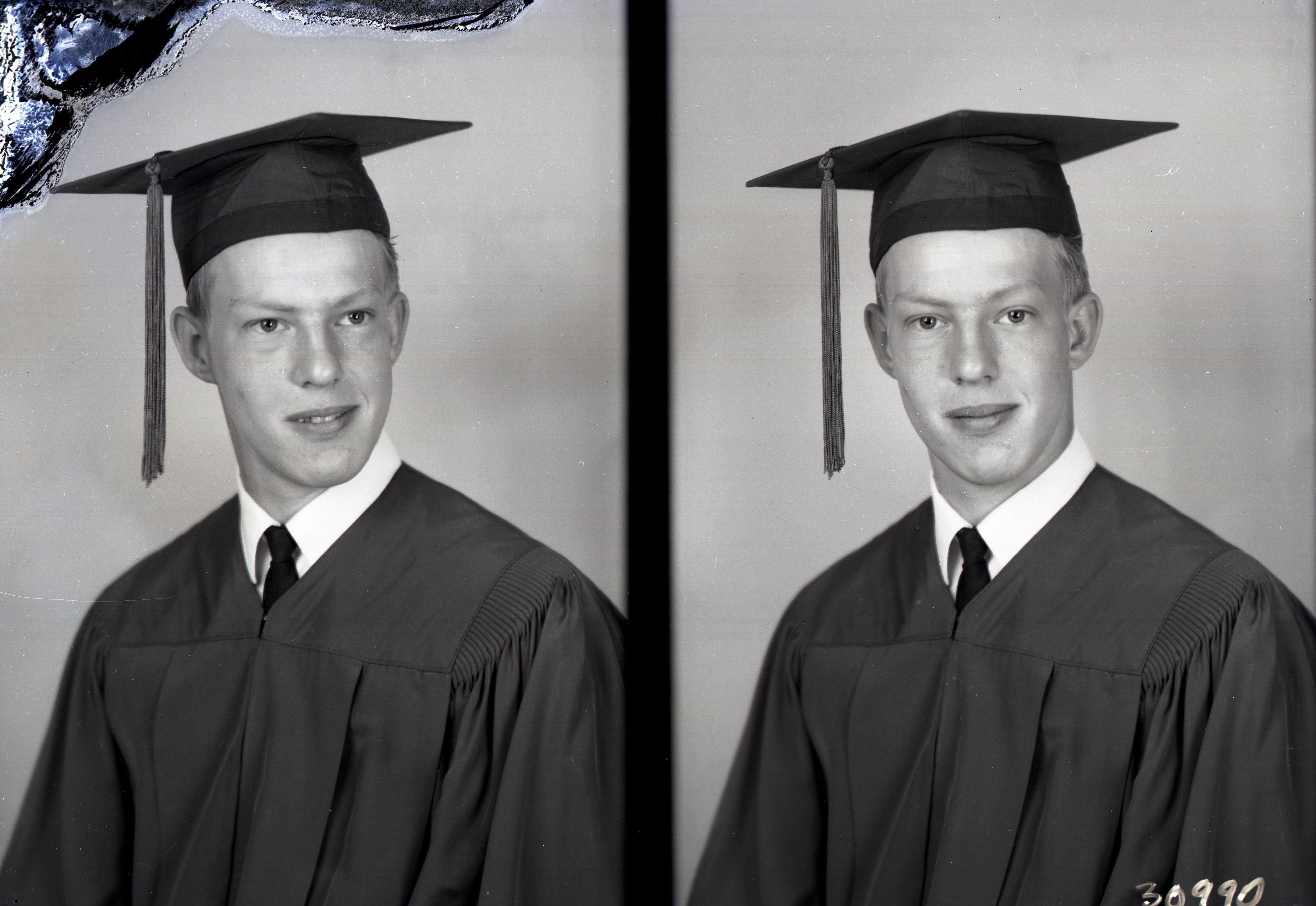 Photo of two separate portrait photographs of the same unidentified young man wearing his graduation cap and gown.