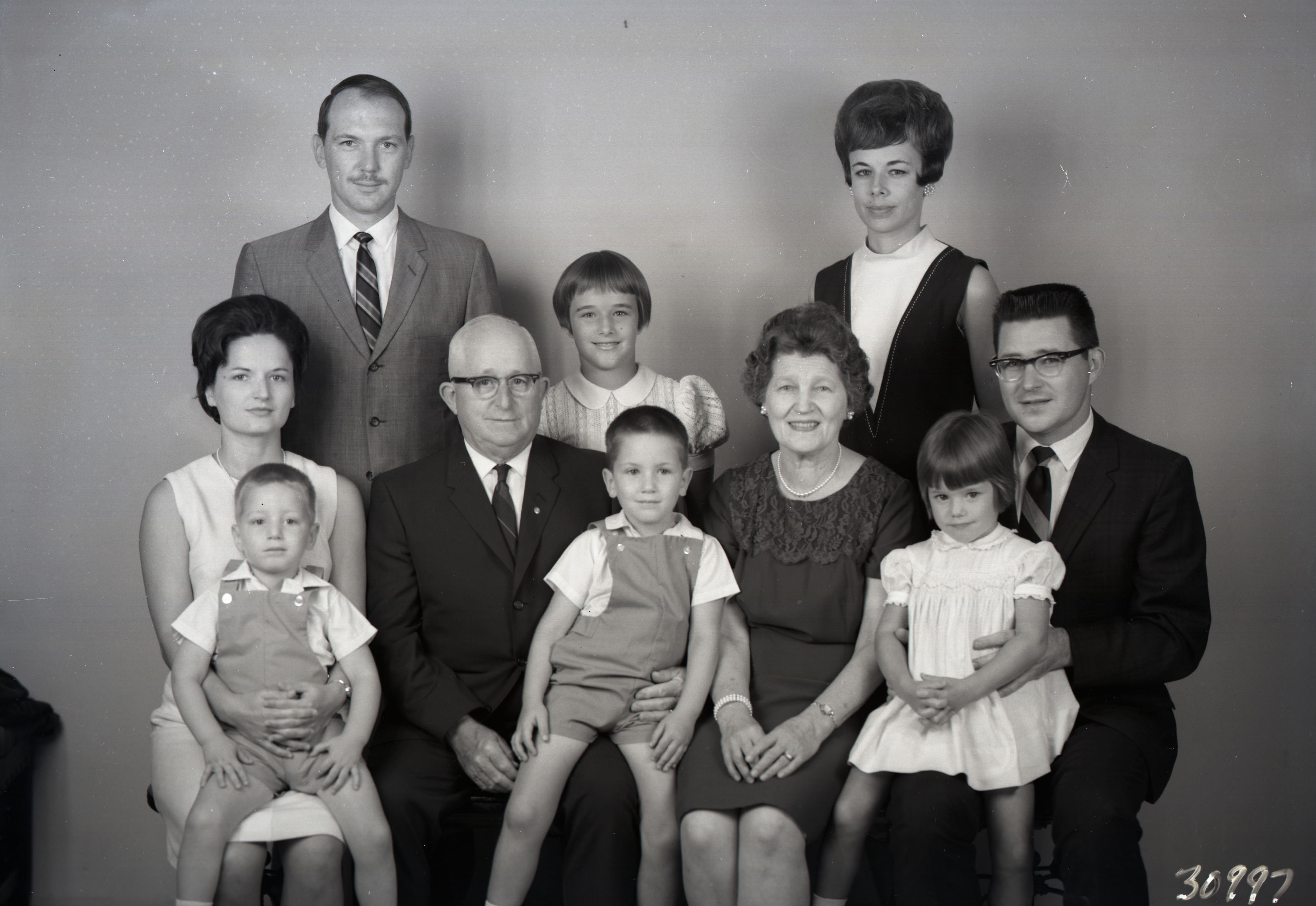Photograph of Ray and Edna (Hoover) Tamkin later in their lives, seated in the middle of the photograph. Their two adult children, Lewis Donald Tamkin and Reba Marie Tampkin, their spouses, and four unidentified grandchildren are posed with them.