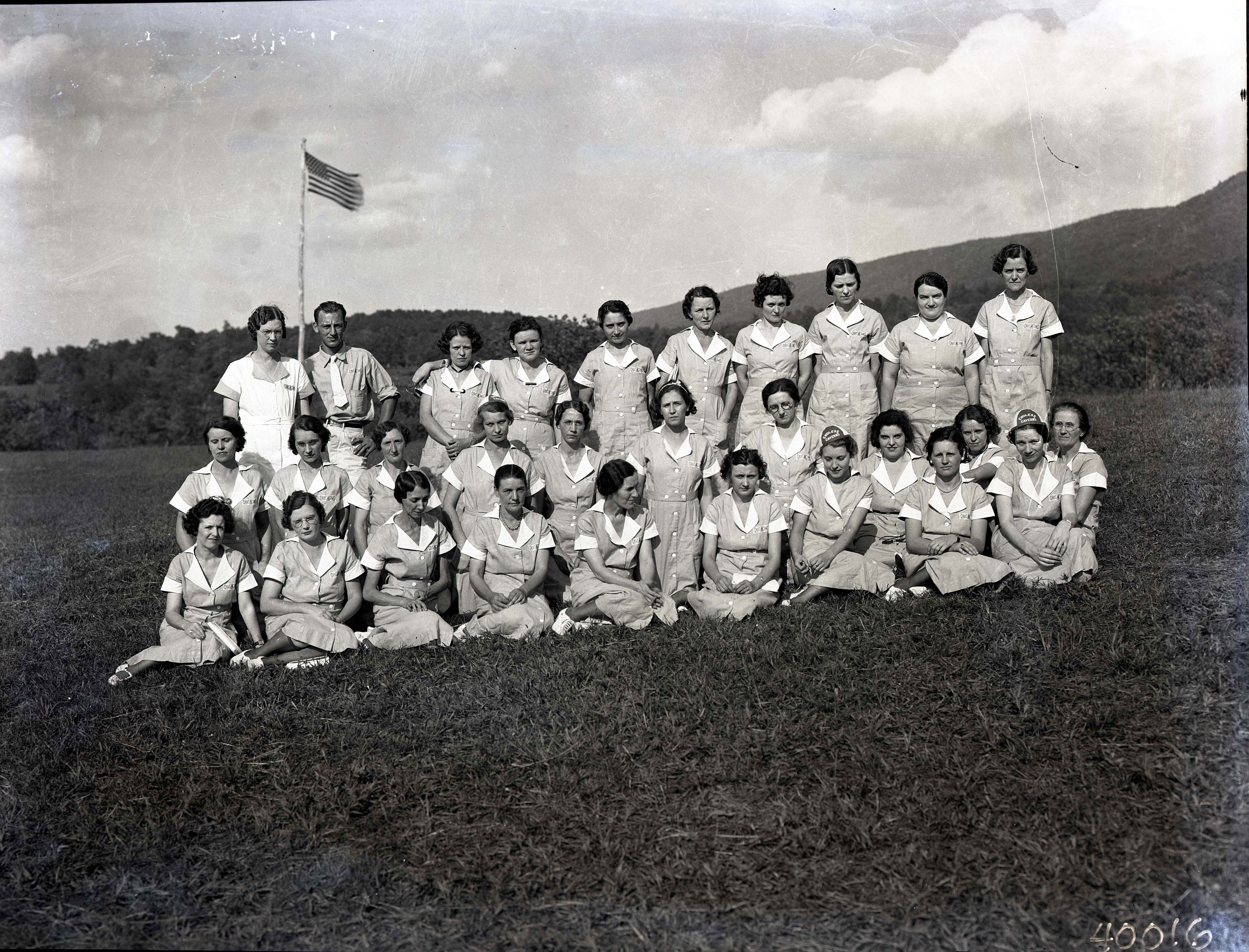 Most of the women are wearing uniforms with a label stitched on the front that reads, "Casey Jones". A few are wearing hats that say, "Endless Caverns".