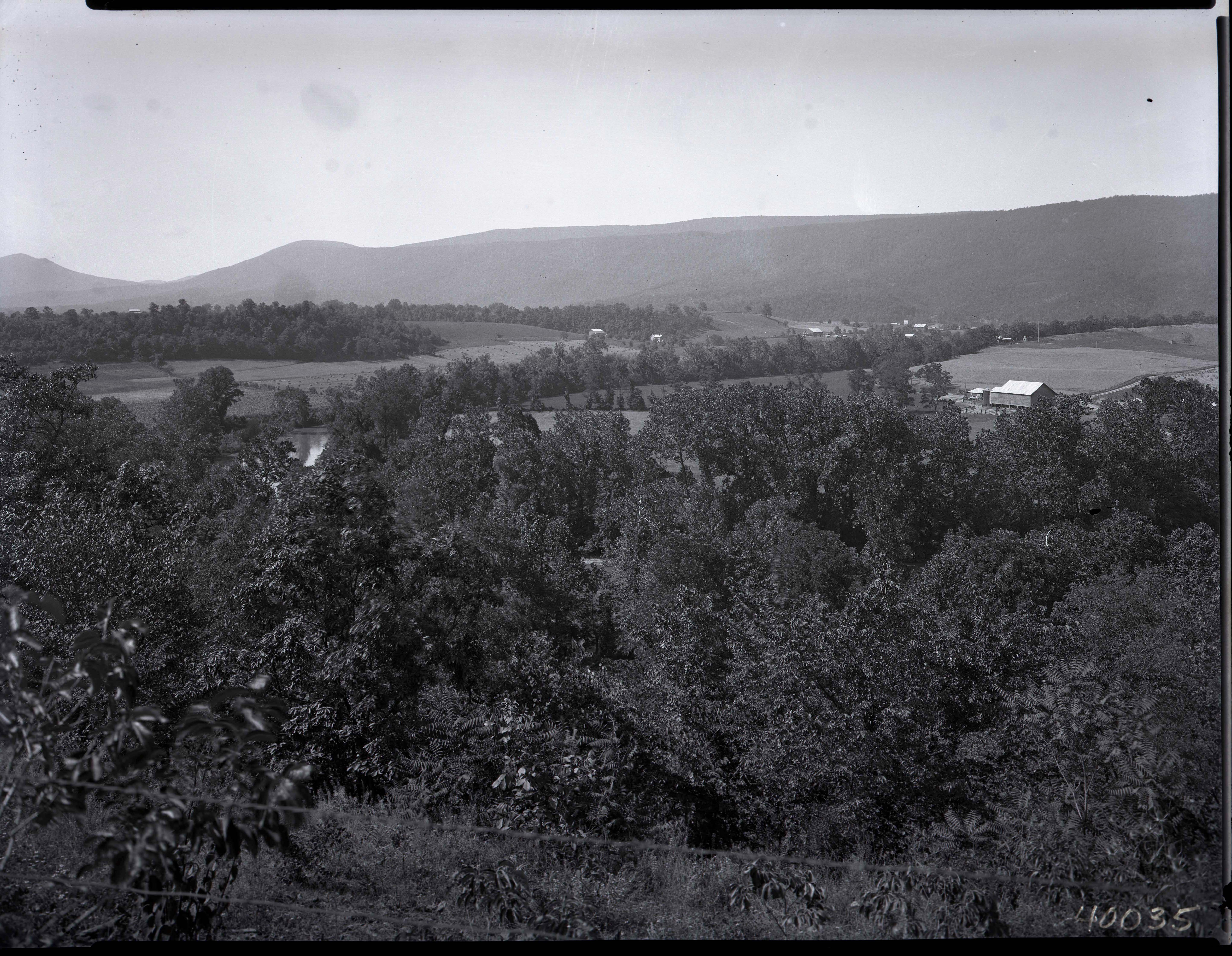 A view of a rural area north east of Edinburg Virginia. The Edinburg Gap in the Massanutten Mountain and the Shenandoah River are both visible.