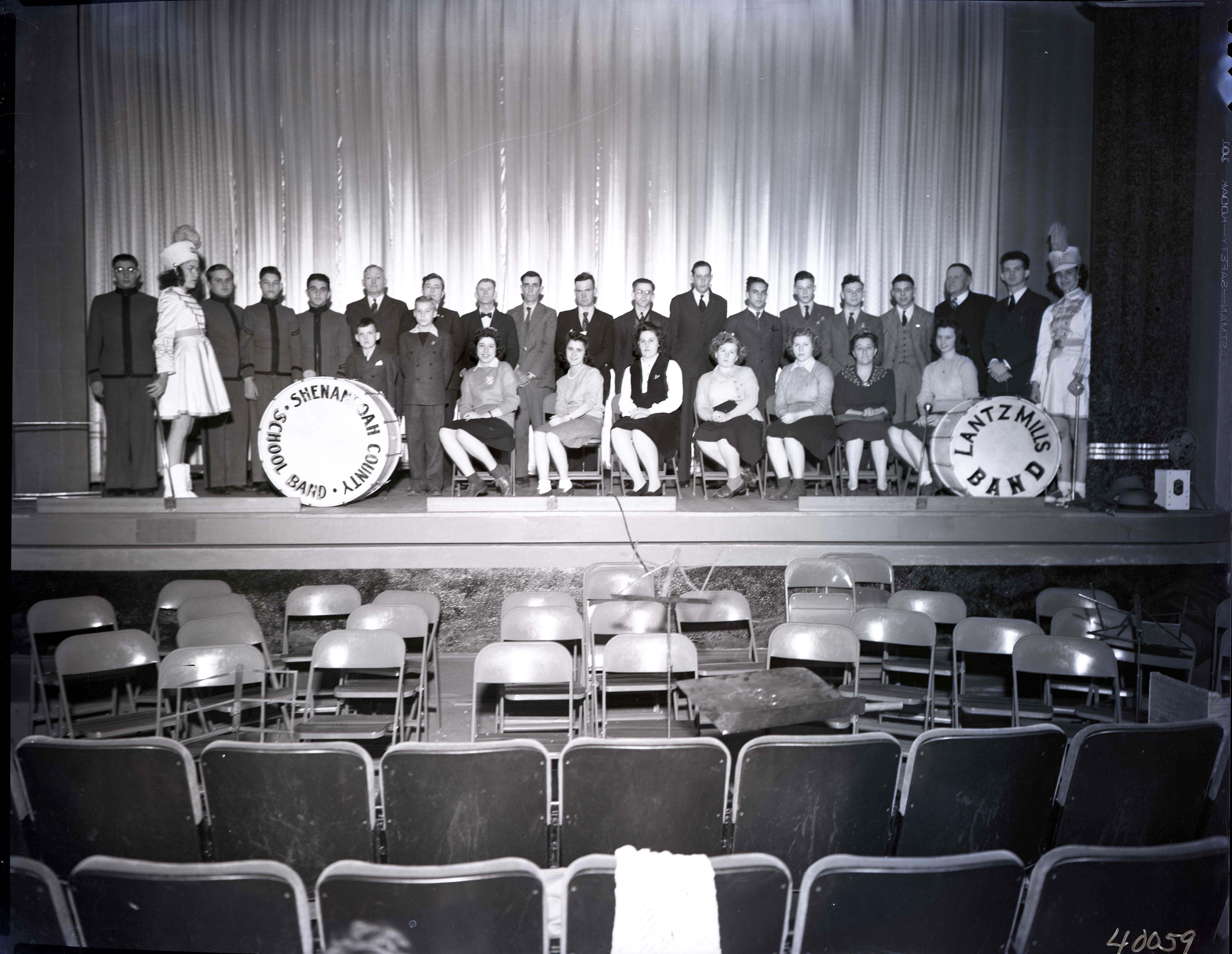 Two drums are on stage with them. One reads, "Shenandoah County School Band" and the other says, "Lantz Mills Band".