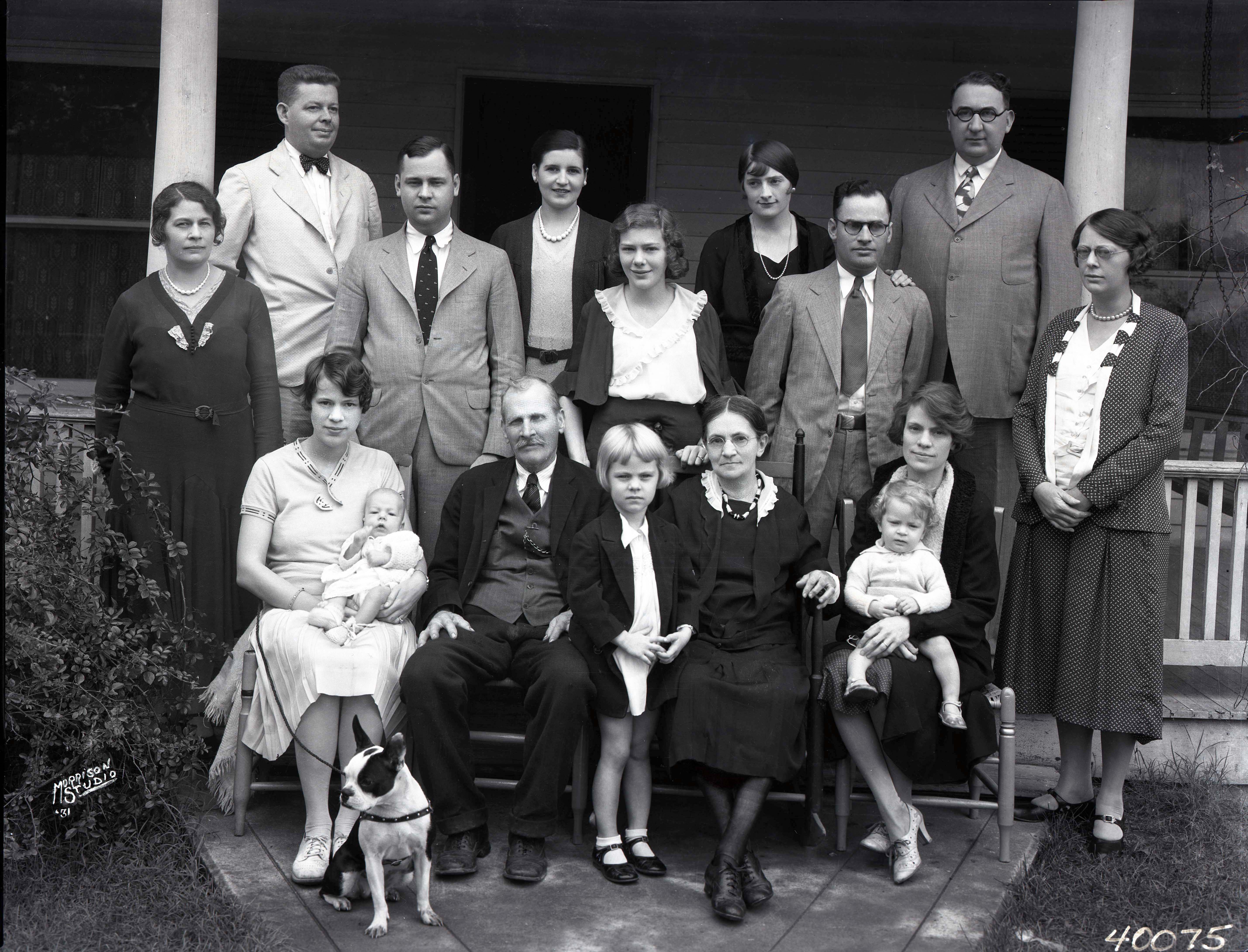 An older man with a mustache and woman are seated in the front center and surrounded by seven unidentified women, four unidentified men and three young children.
