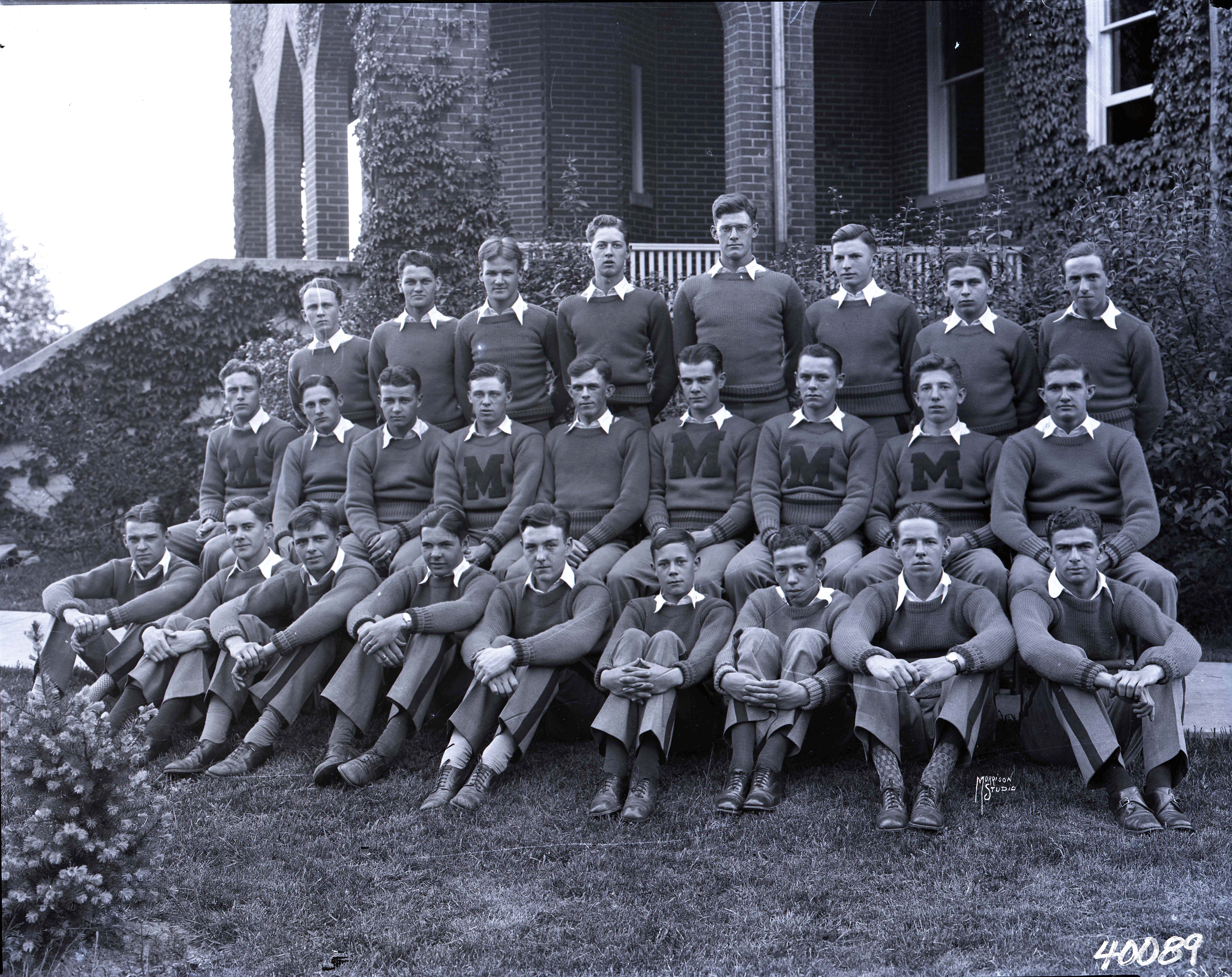 Group of twenty-six unidentified cadets from Massanutten Military Academy (MMA) posed in three rows in front of Lantz Hall.