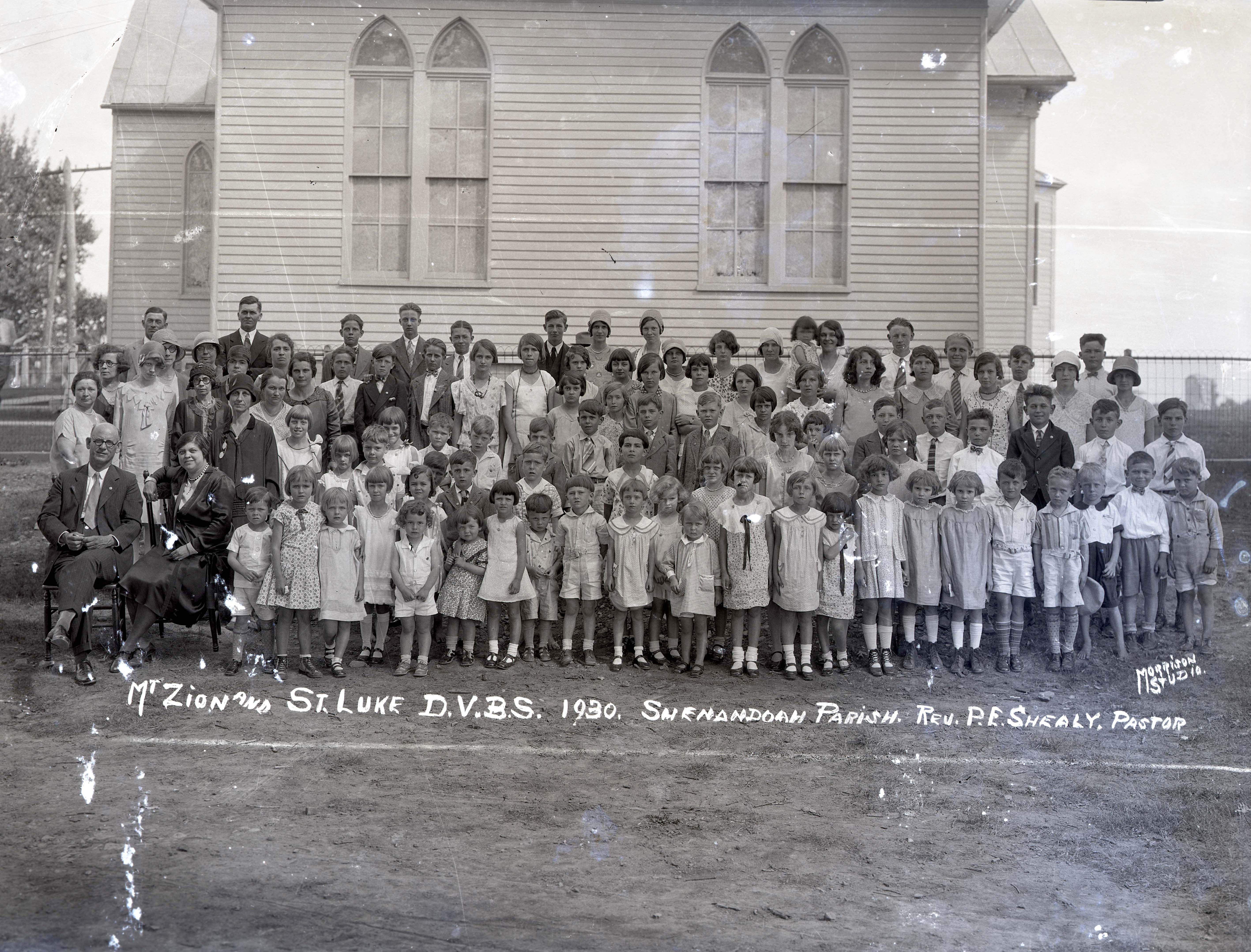 The photographer has noted at the bottom: "Mt Zion and St. Luke D.V.B.S. 1930 Shenandoah Parish. Rev. P.E. Shealy, Pastor".