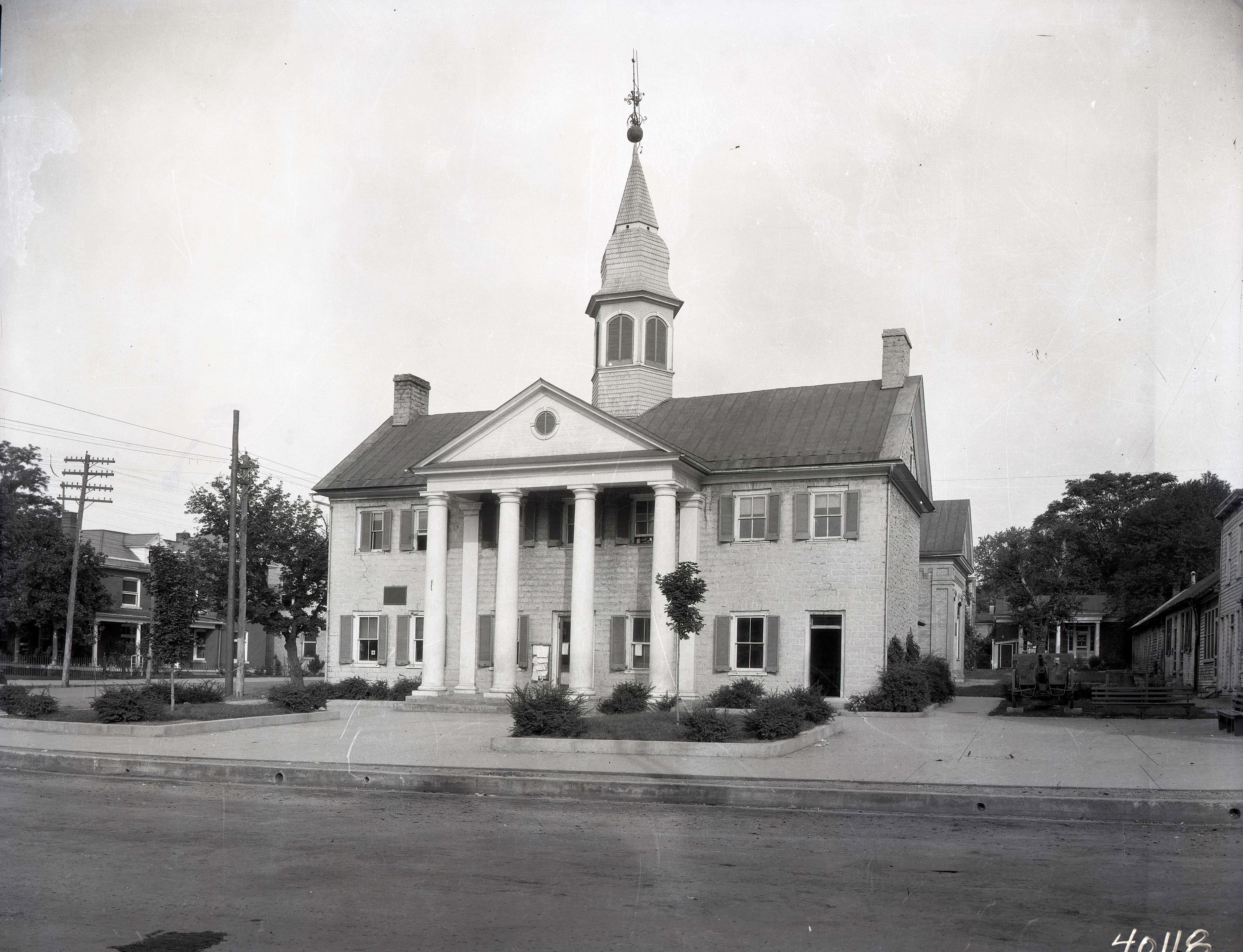 Photograph of the old Shenandoah County Courthouse located on the northwest corner of Court and Main Streets in Woodstock, and taken from across Main Street (U.S. Route 11).