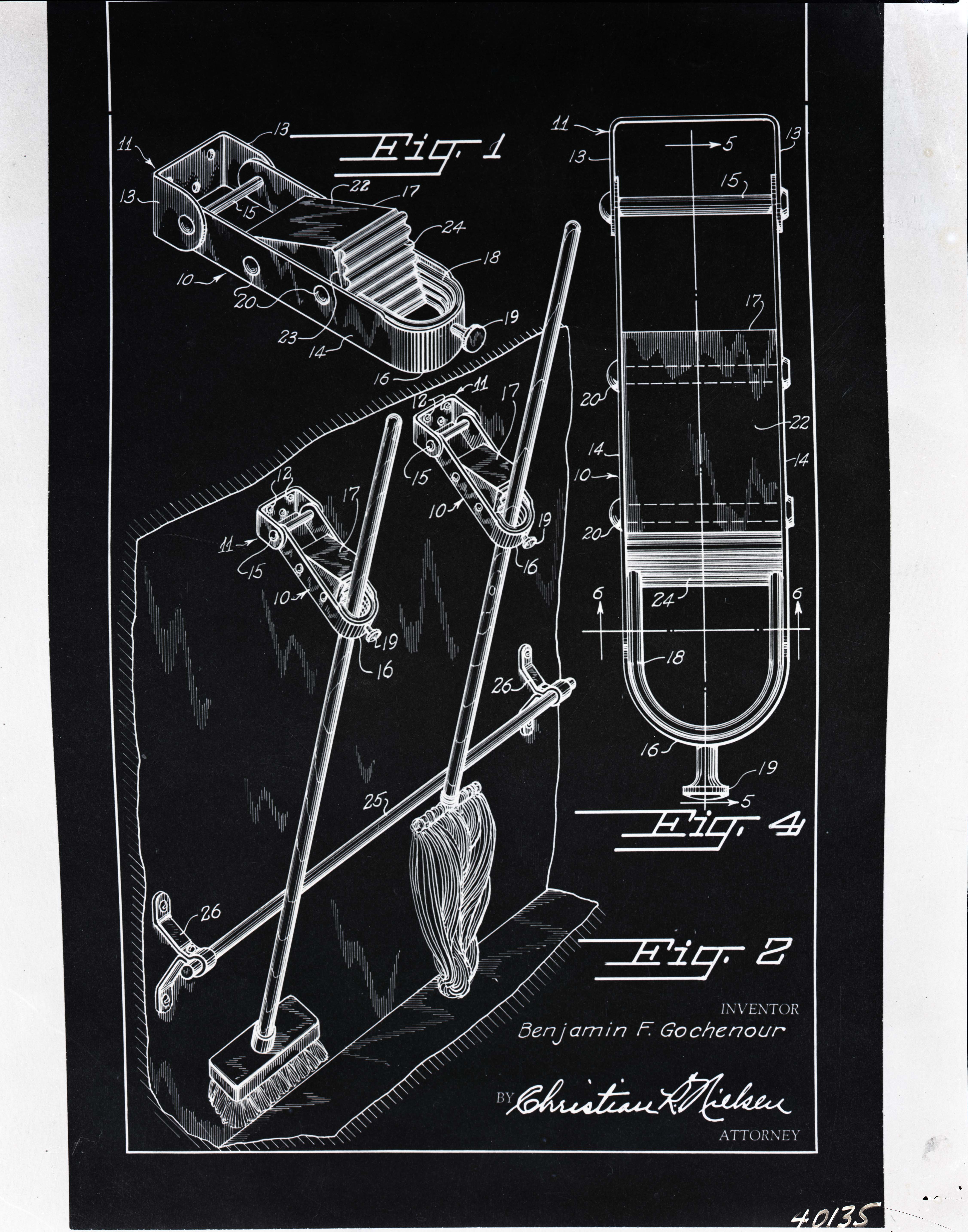Photo of one page of a detailed drawing of the bracket invented by Benjamin F. Gochenour. It includes Figures 1, 2, and 4.