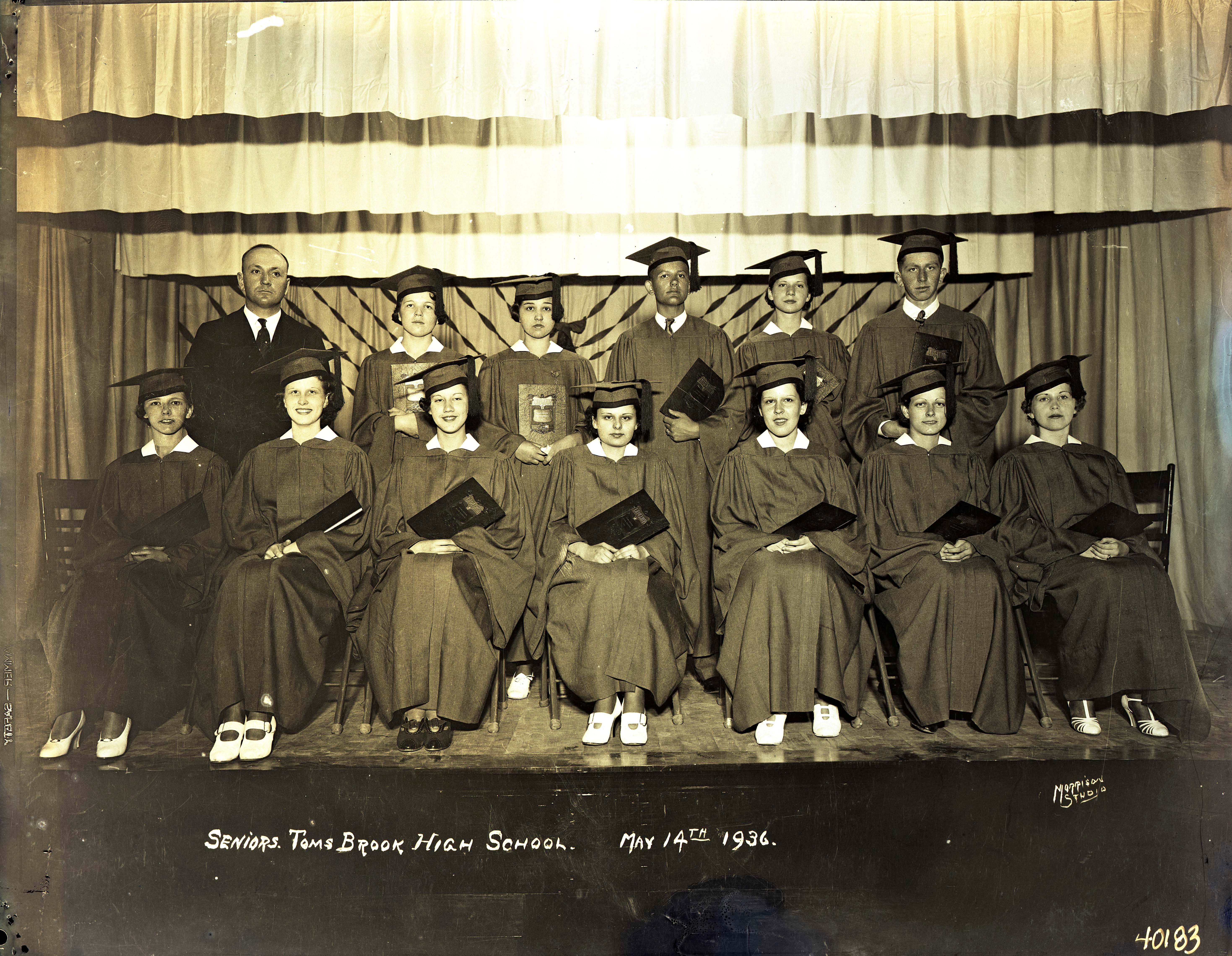 The photographer has written, "Seniors. Toms Brook High School. May 14th, 1936" at the bottom of the image.