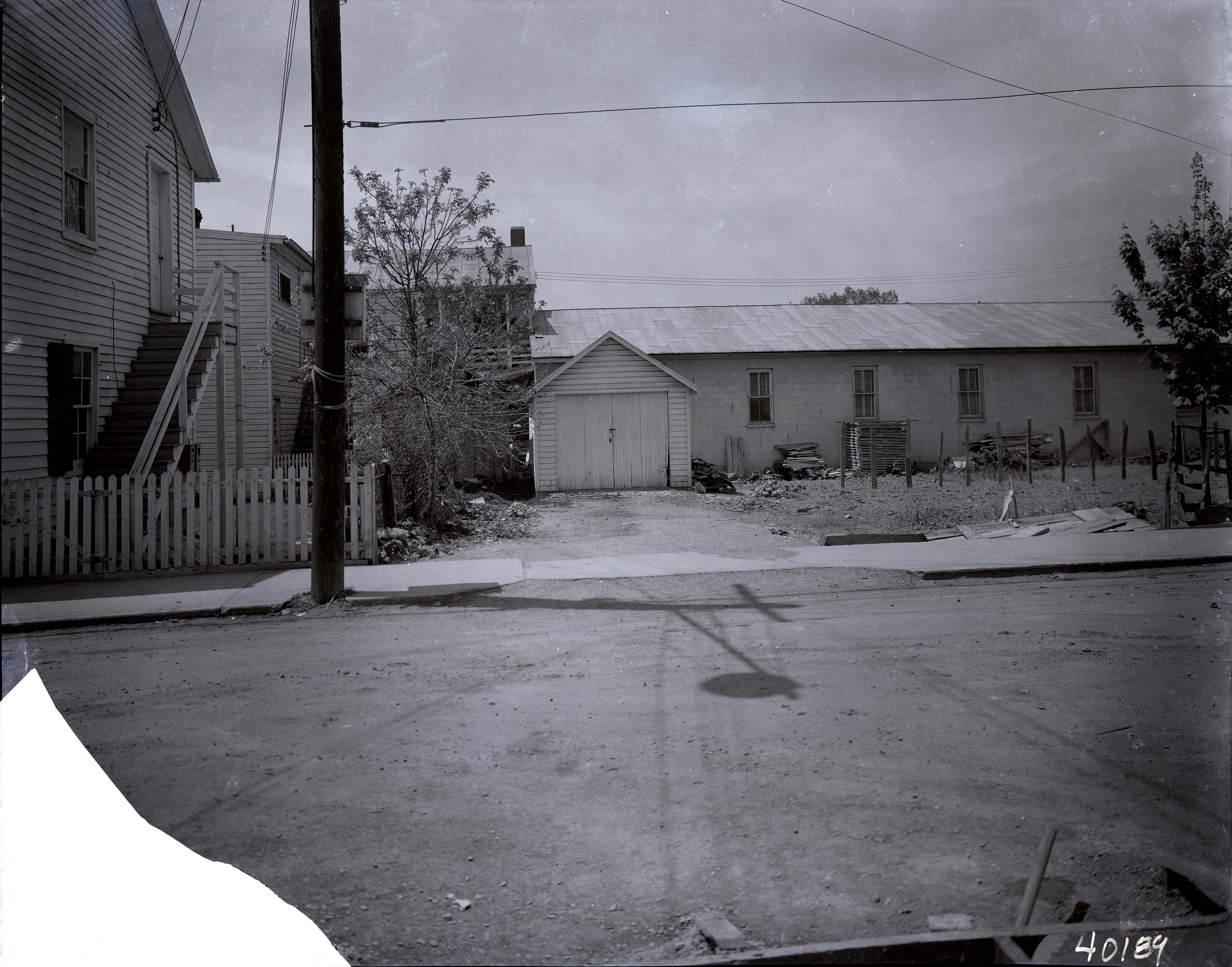 Photograph of an empty lot, a long metal-roofed, building, a detached garage, and the back of buildings.