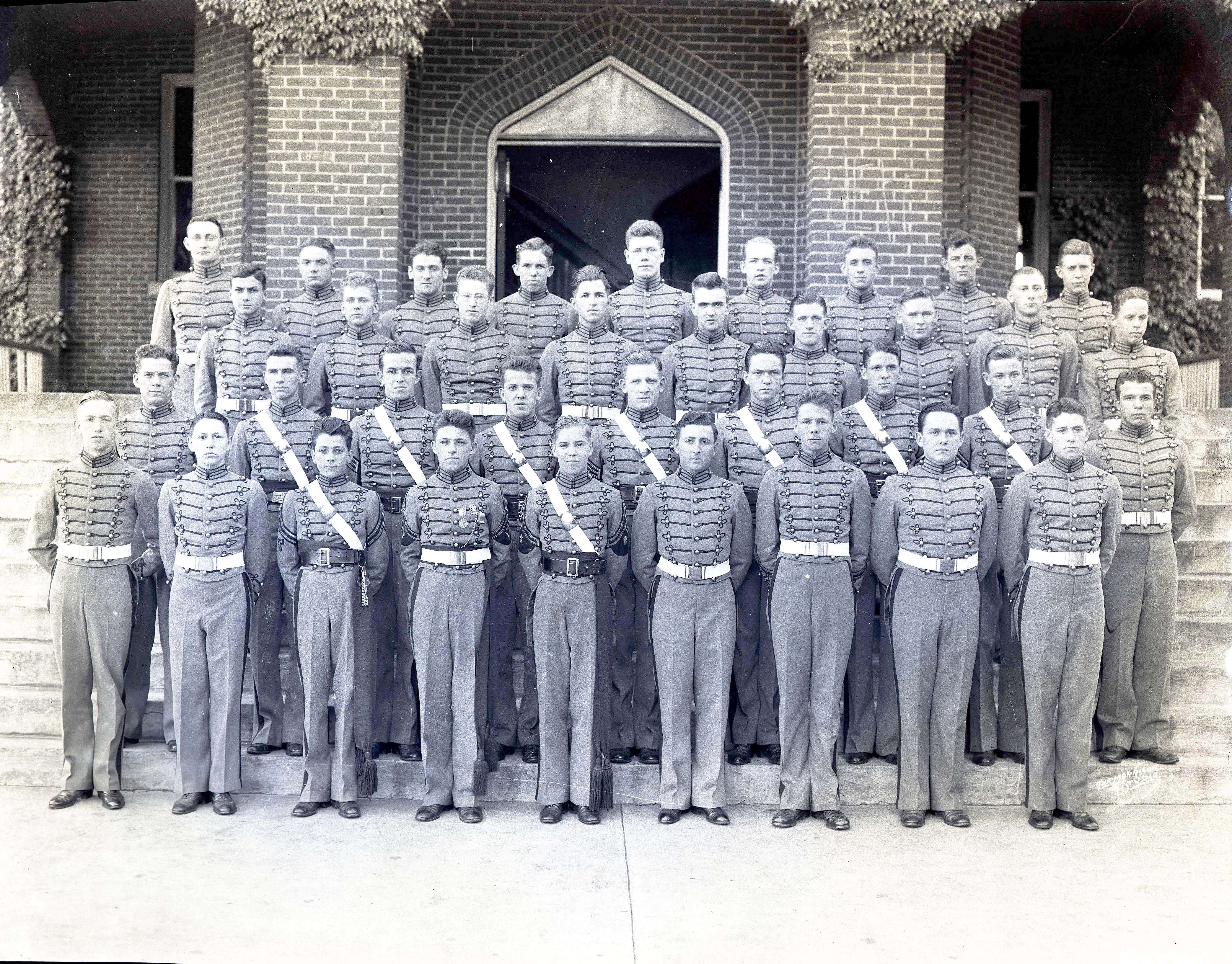 Large group of unidentified cadets from Massanutten Military Academy (MMA) wearing their school's uniform and posed ont he steps of Lantz Hall.