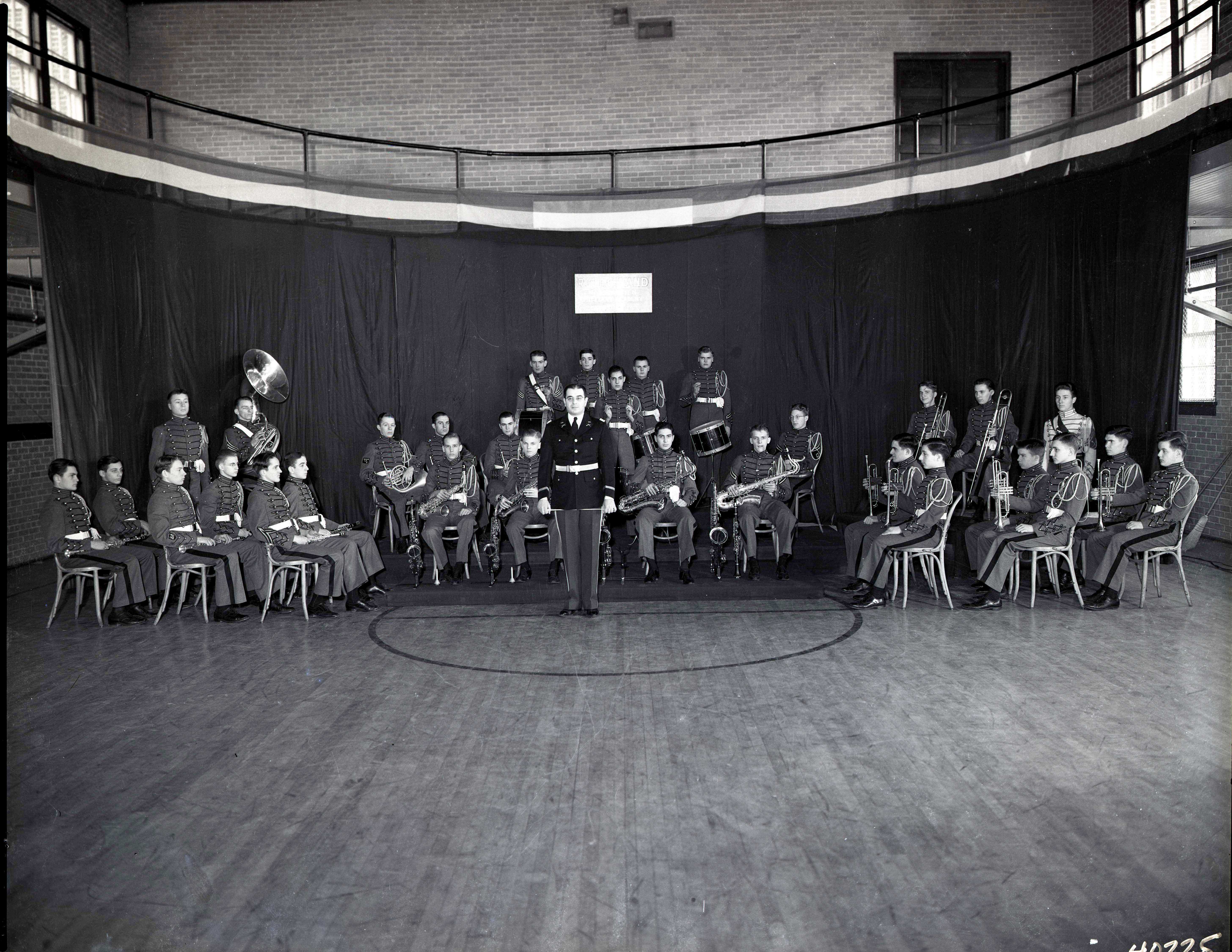 Photograph of Cecil M. Newcorn as Bandmaster of Massanutten Military Academy (MMA) standing in front of the cadets members of the band and their instruments.