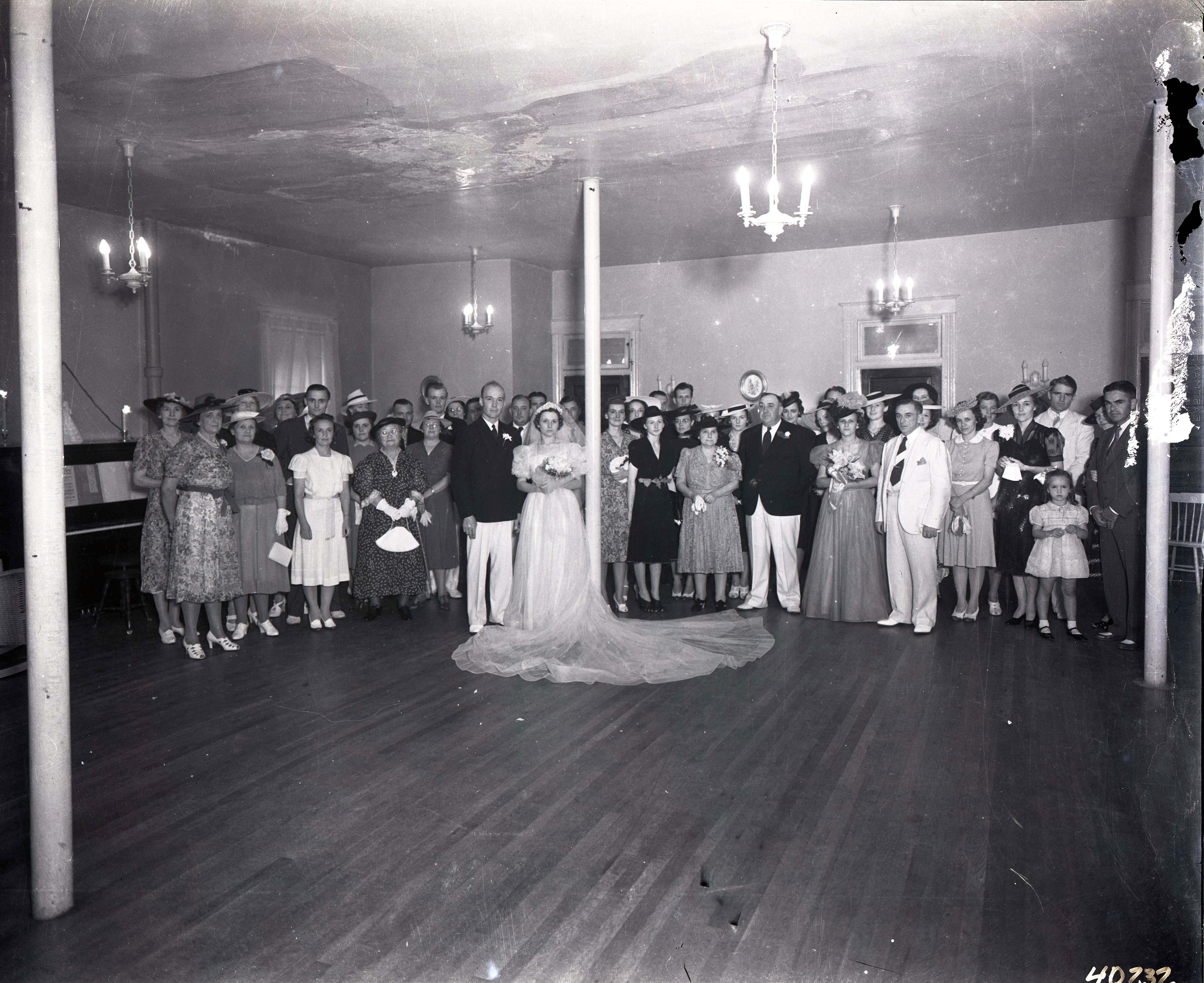 Photograph of many unidentified wedding guests standing with the bride, Eleonor Moffett (Holtzman) Frederickson, and the groom, Fred Frederickson, at their wedding.