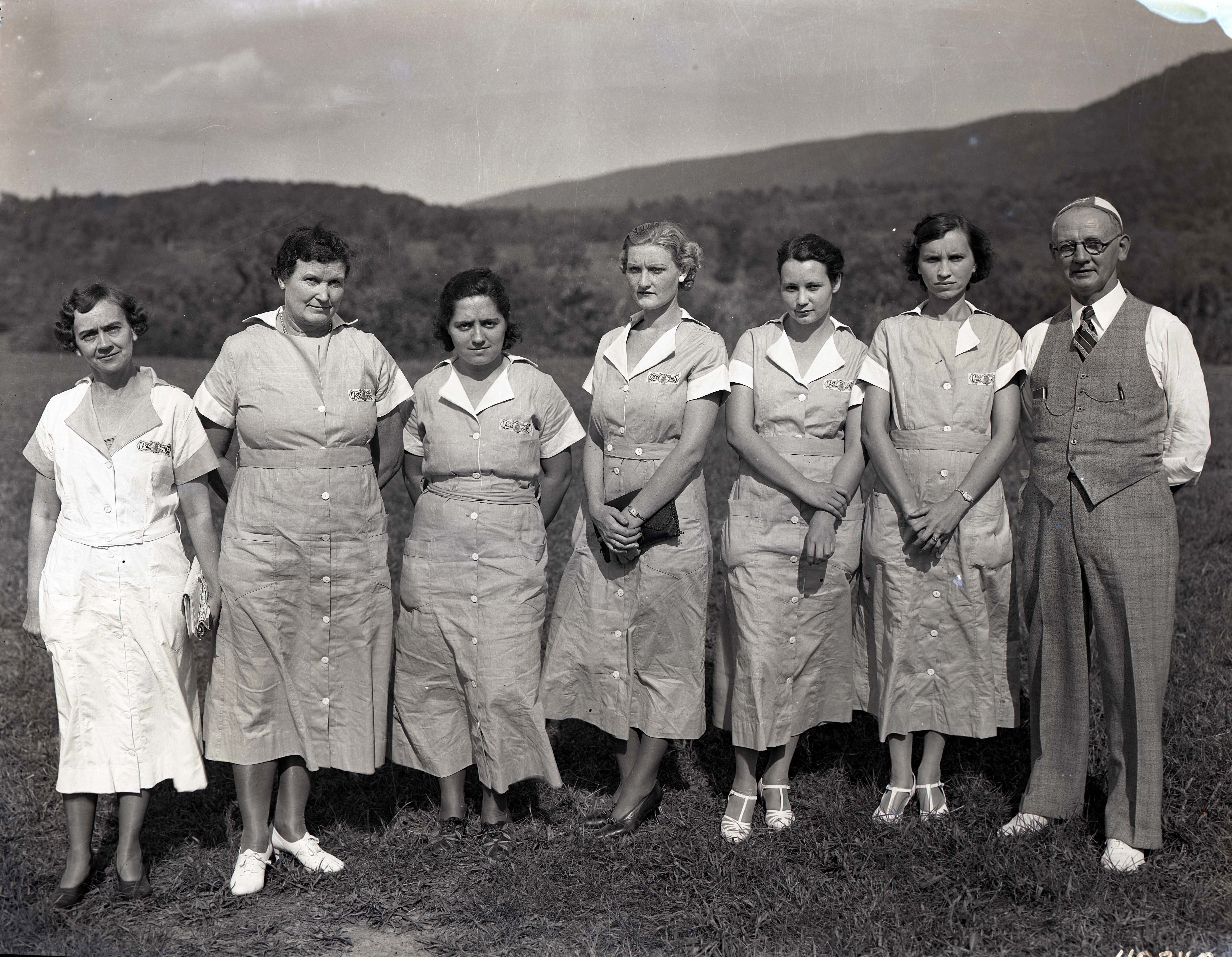 Group of six unidentified women and one unidentified man (far right) posed together outdoors. These were employees of one of the area's Casey Jones plants photographed at the Endless Caverns in New Market.