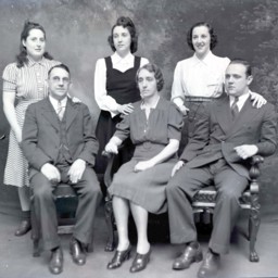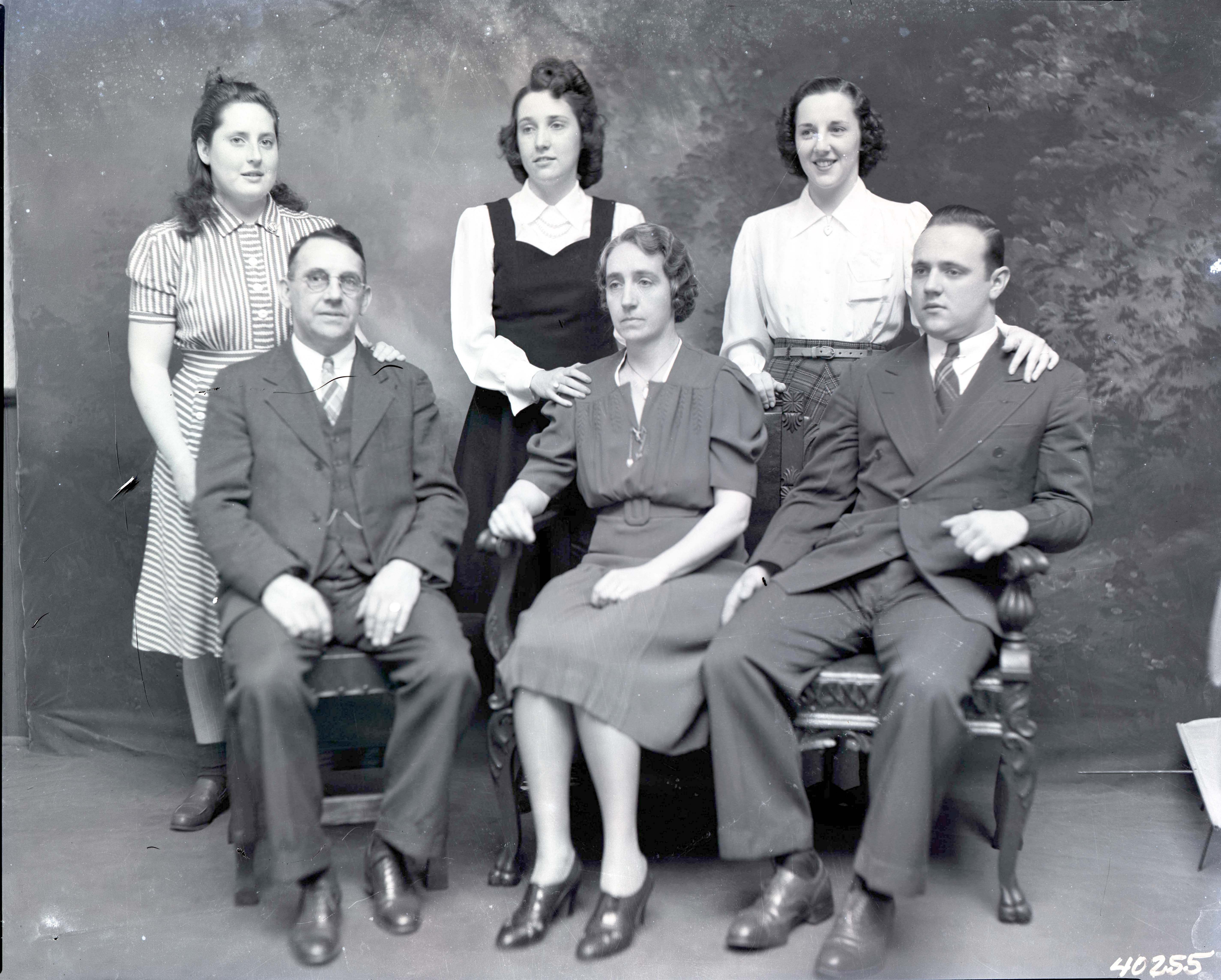 Unidentified man and woman are seated with three unidentified young women standing behind them and an unidentified young man in a suit seated beside them.
