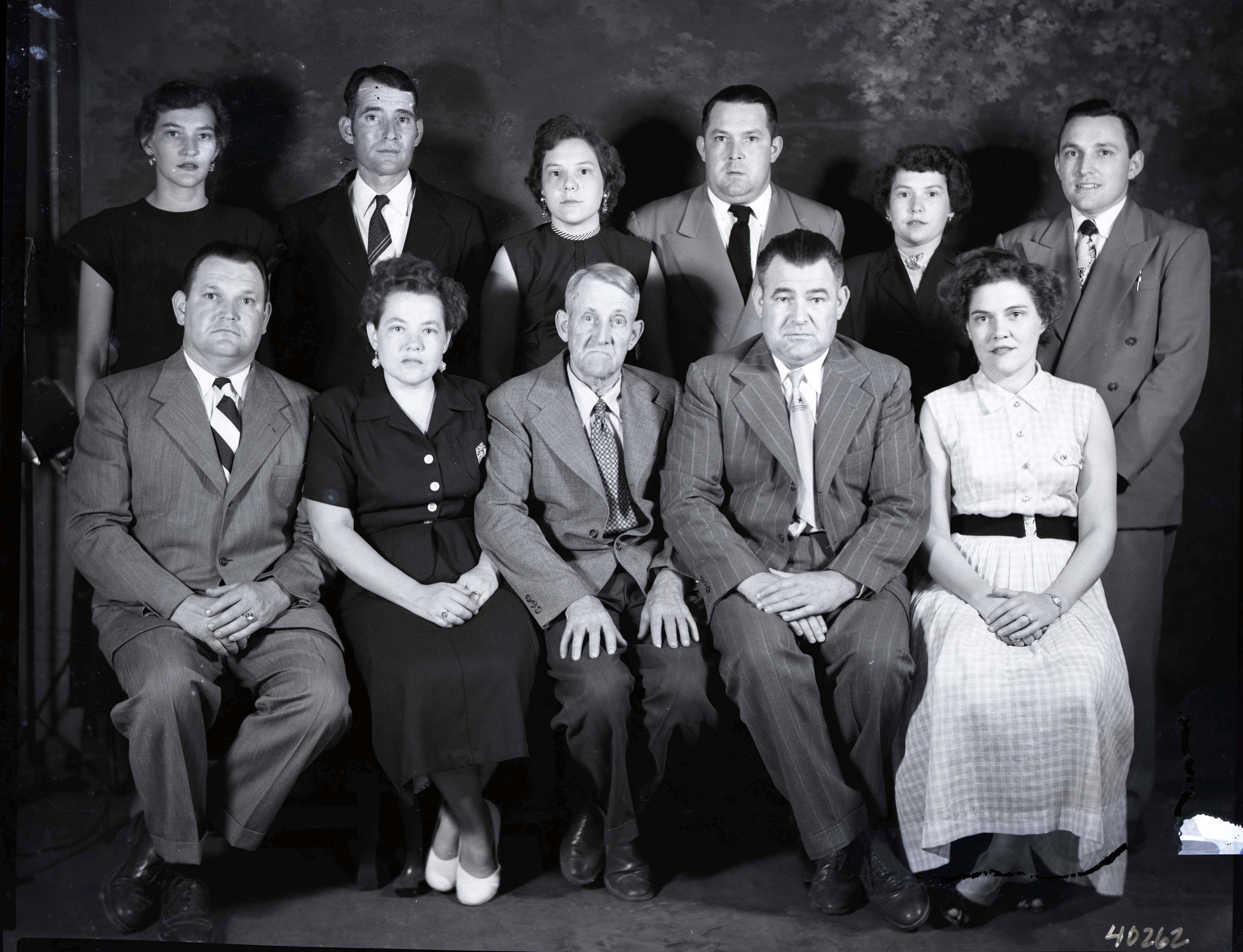 Photograph of Hubert Franklin Shrum, seated in the center, with his ten children posed around him.