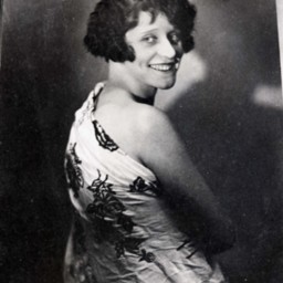 Unidentified woman with short curly hair is shown looking back over her shoulder and smiling at the camera.