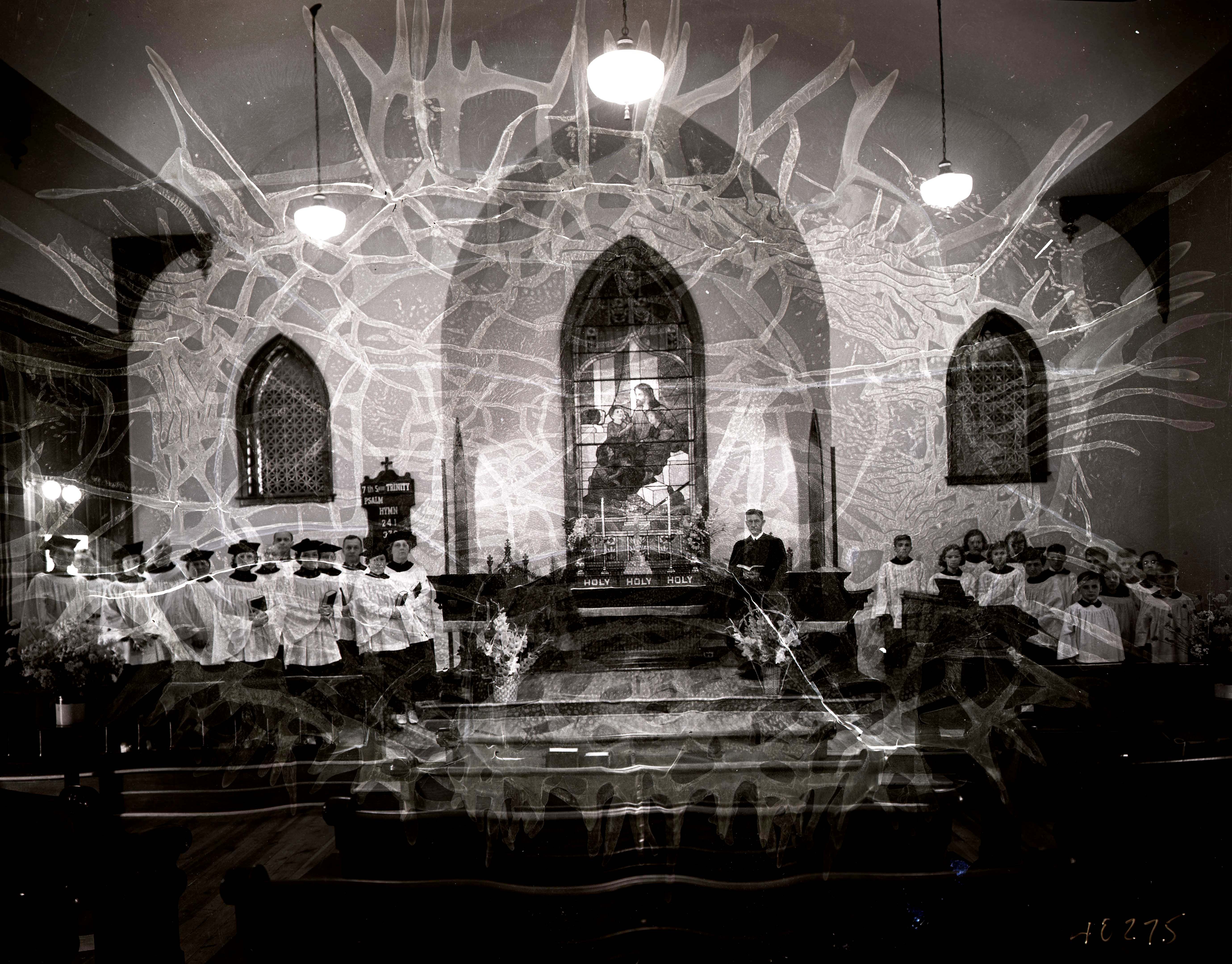 The adult church choir is on the left and the Children's Church choir is on the right. Most of the choir members are unidentified.