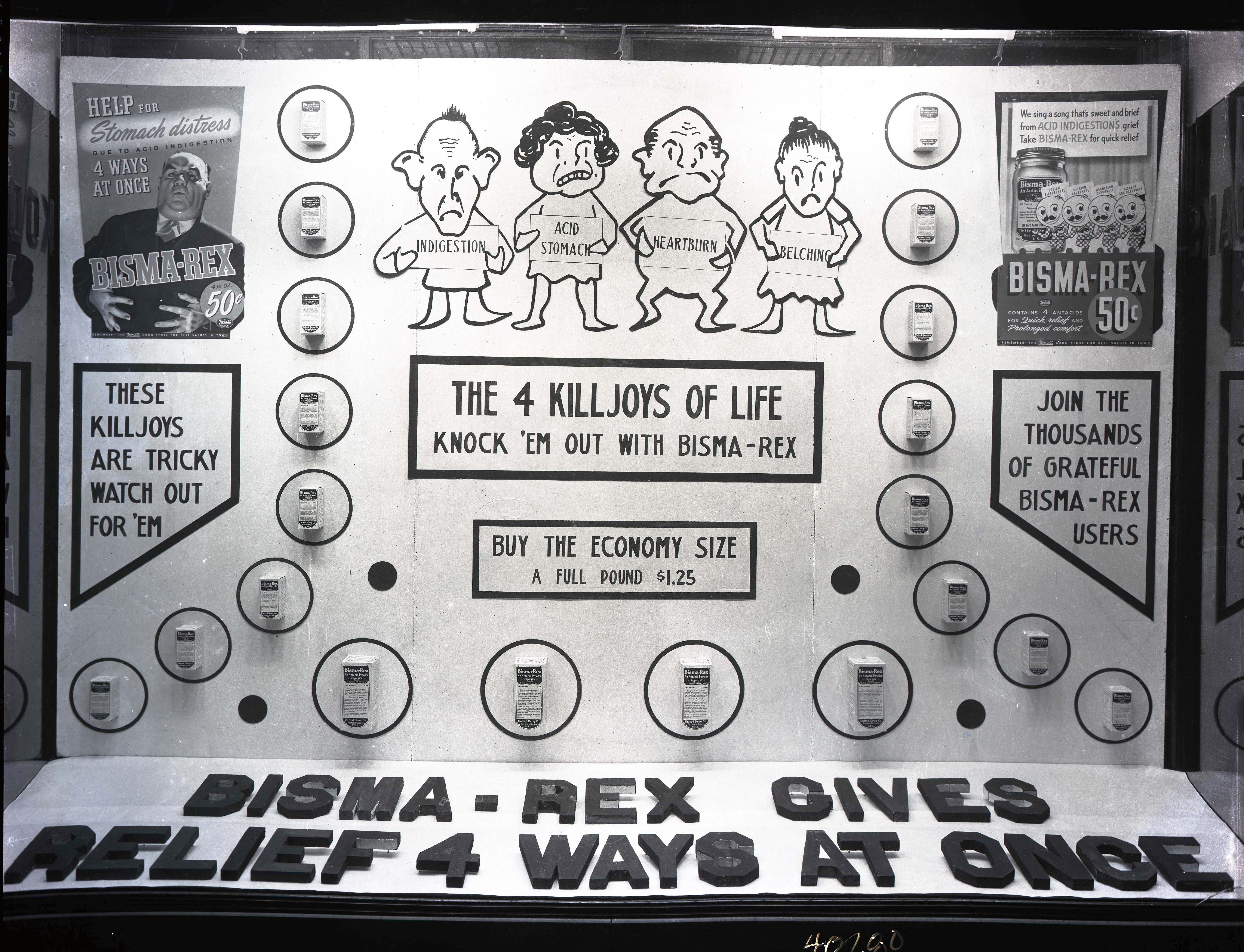 Photograph of an advertisement for Bisma-Rex, a product promising to give relief from indigestion, acid stomach, heartburn, and belching.