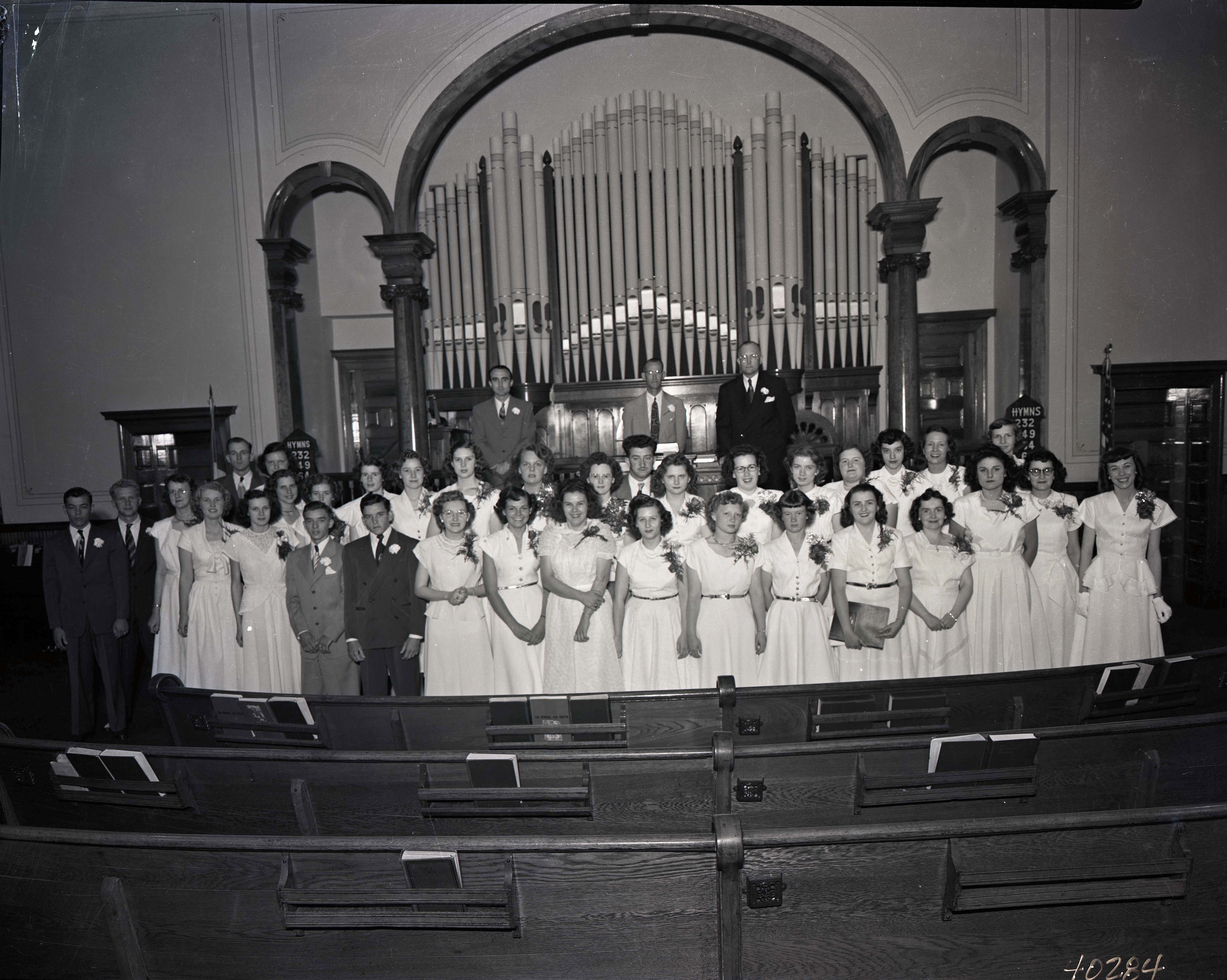 Group of unidentified young men and women are posed together on the altar of the Woodstock United Methodist Church.