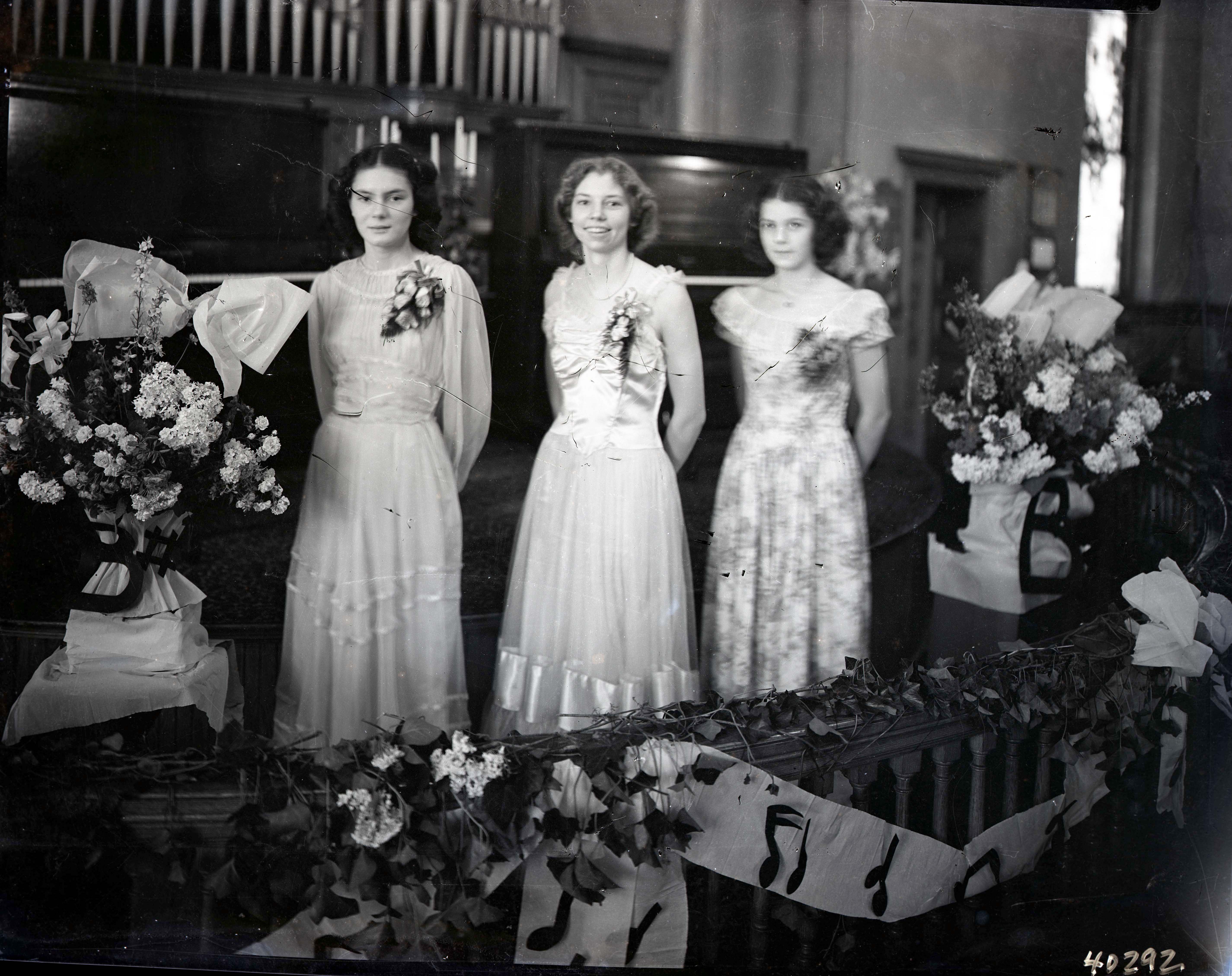 Photograph of three unidentified young women standing together on the altar of Woodstock United Methodist Church.