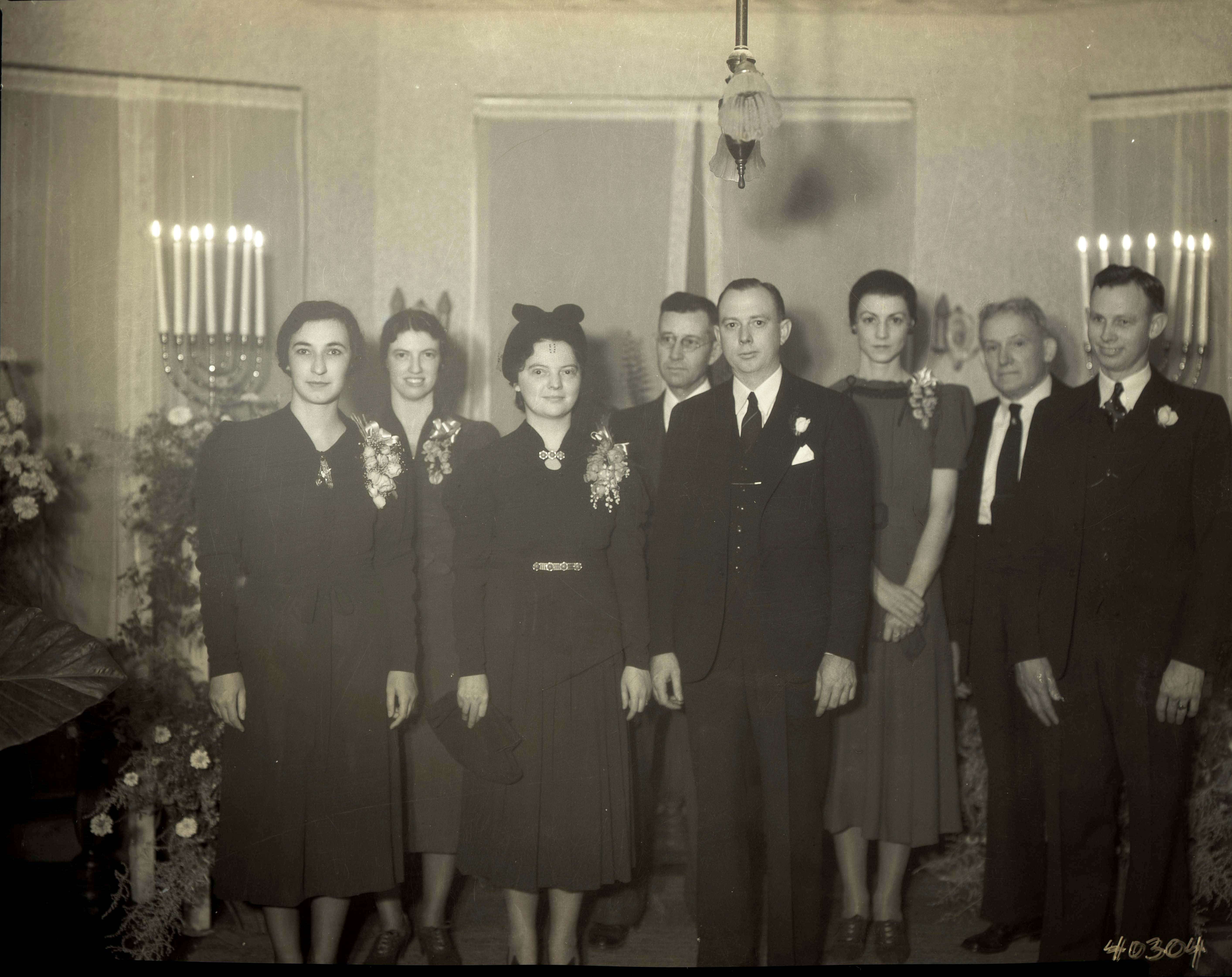 Group of eight unidentified men and women standing together in a room with floral arrangements and candles.