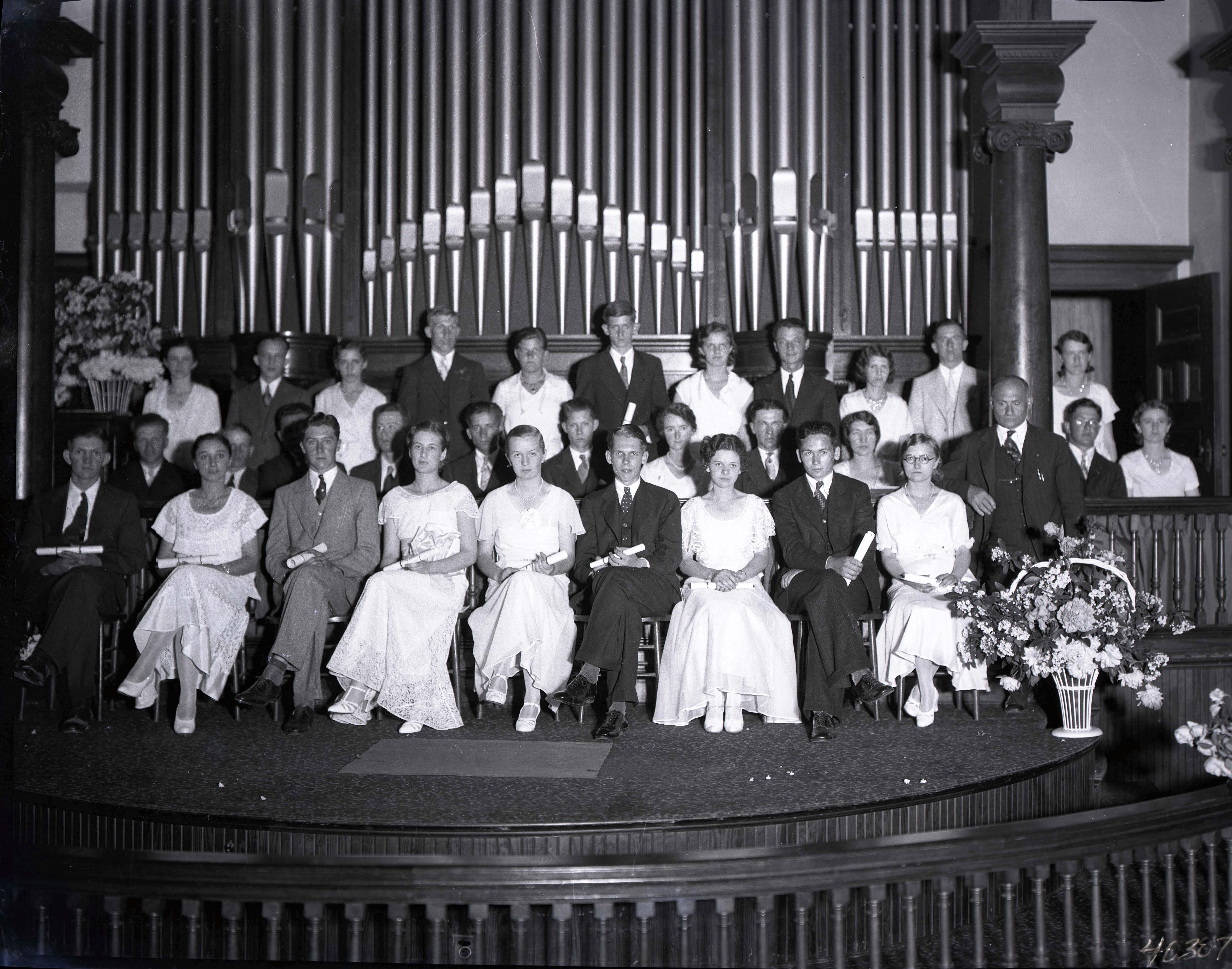 Photograph of a group of unidentified men and women assembled on the altar of Woodstock United Methodist Church.