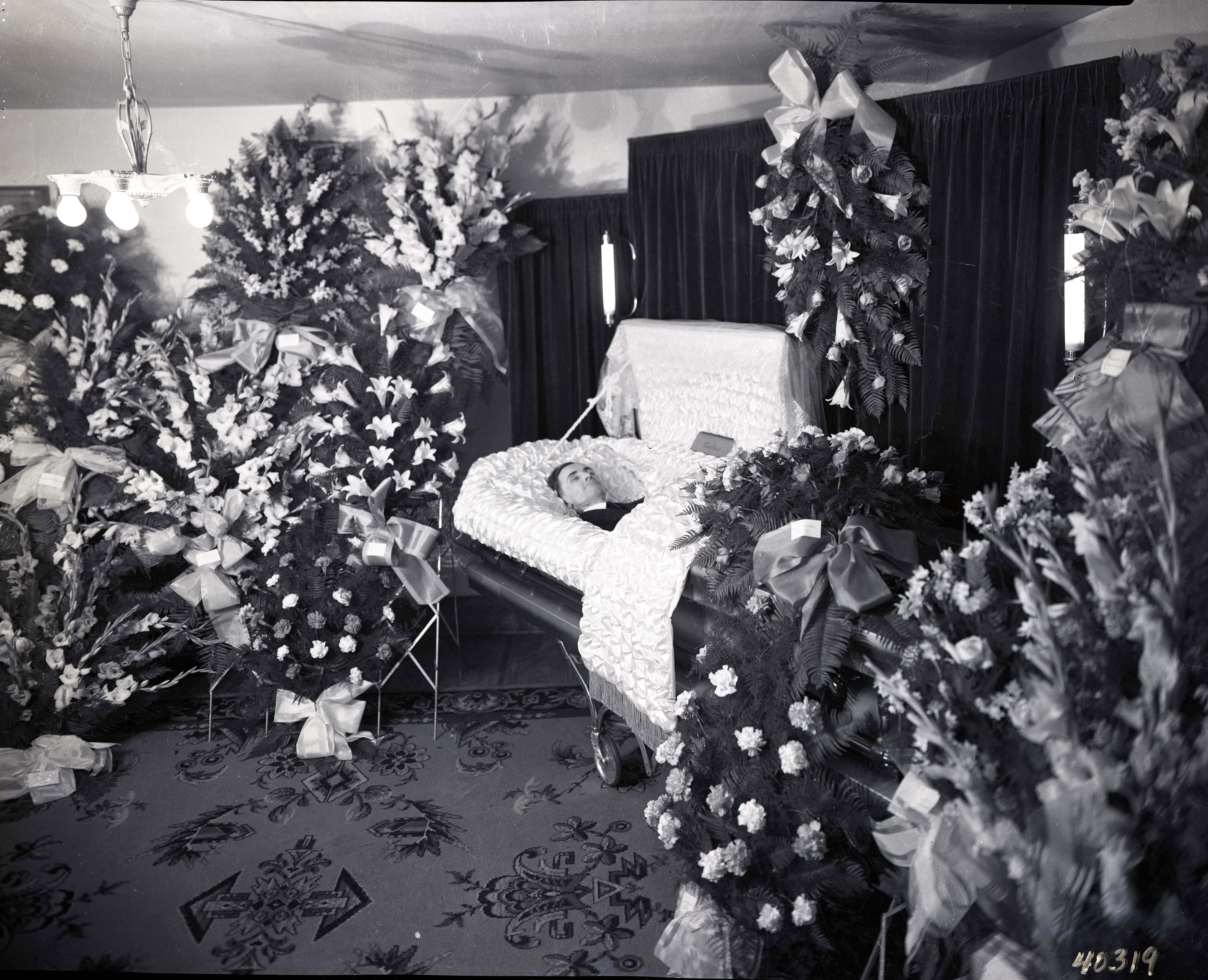 Unidentified dead man is lying in a satin-lined casket surrounded with flowers on both sides.