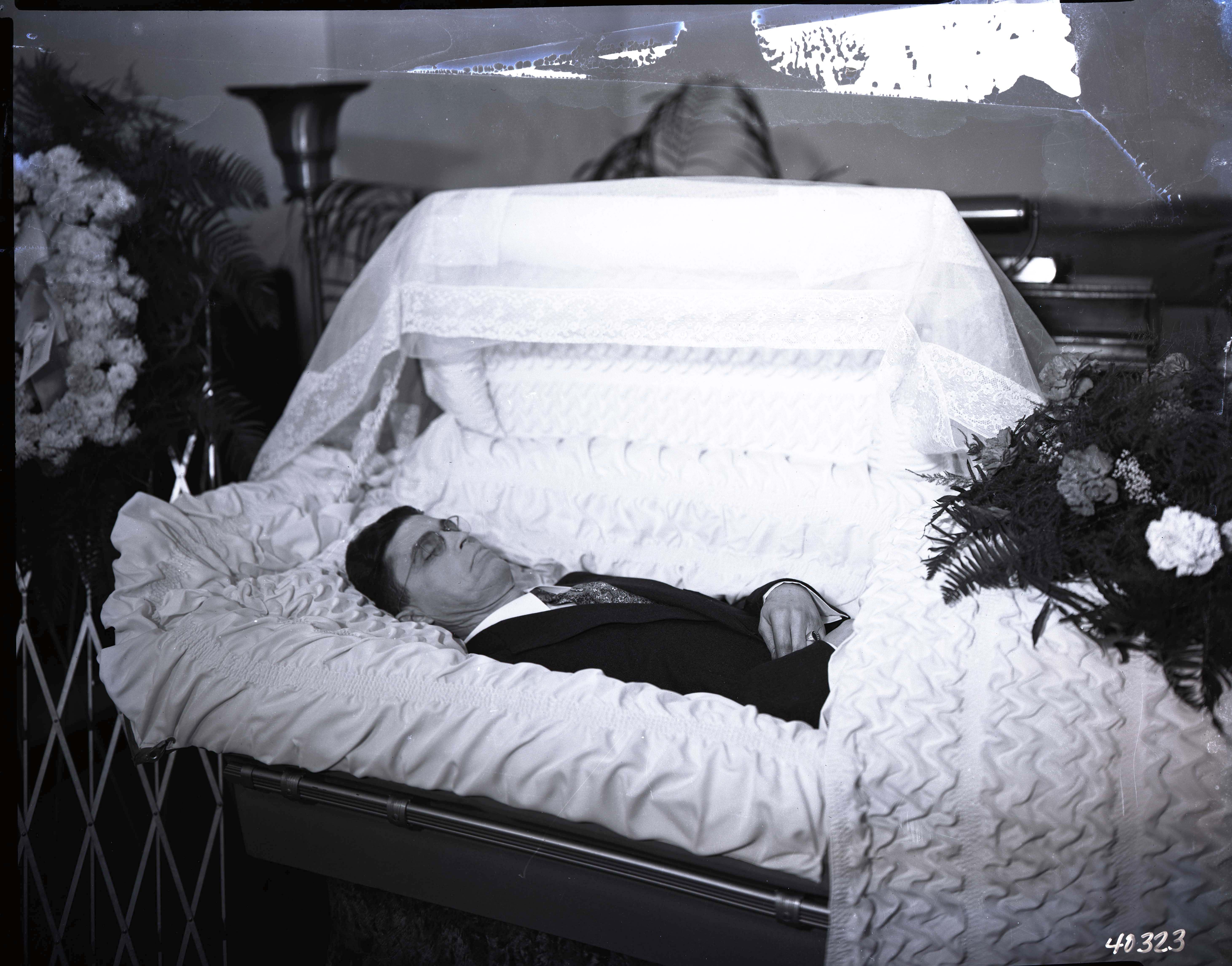 Unidentified dead man with glasses is lying in a satin-lined casket.
