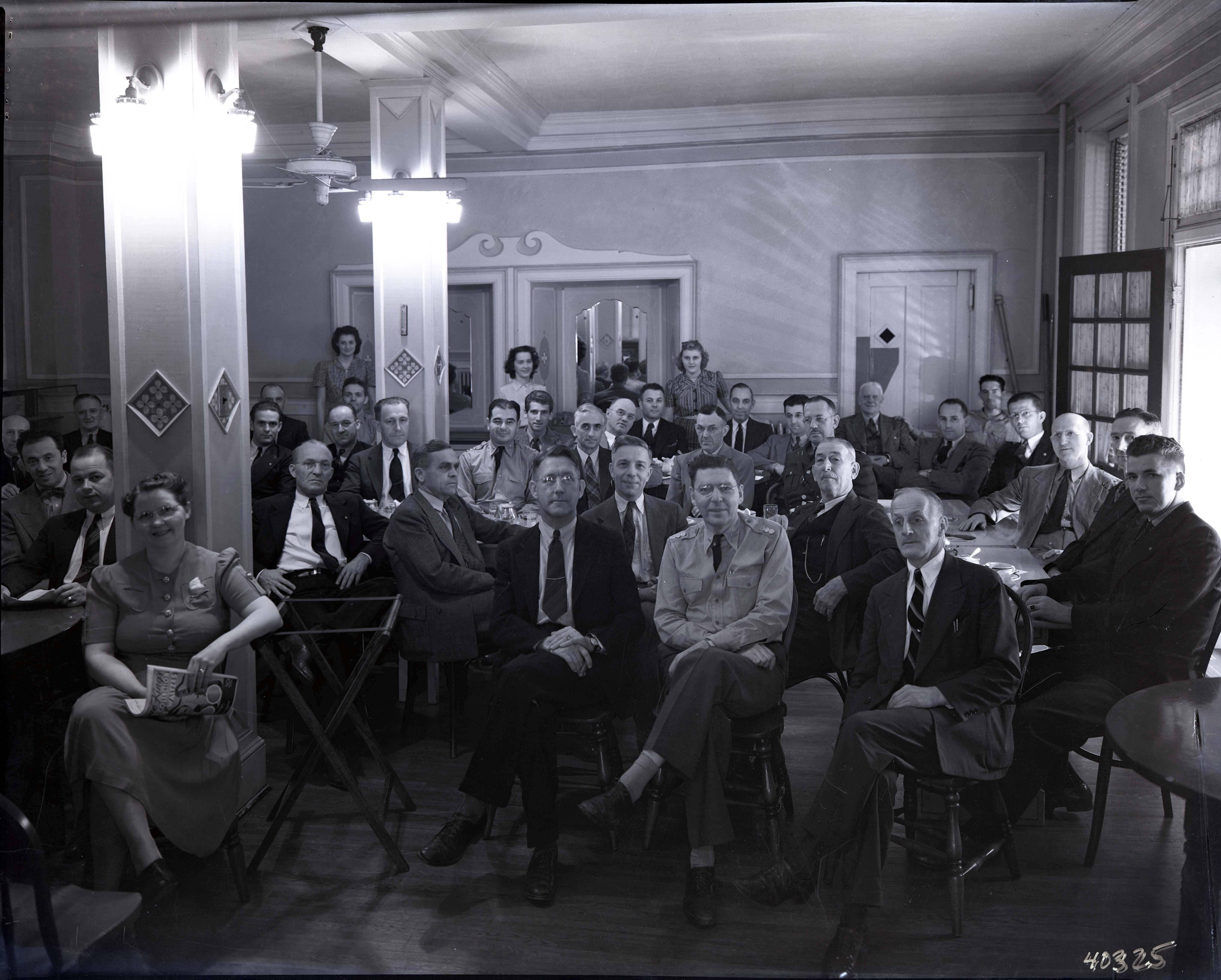 Identified are Milton C. Hollingsworth (in front of the rear column towards the back of the room) and Cecil M. Newcorn in uniform (on Hollingsworth's left).