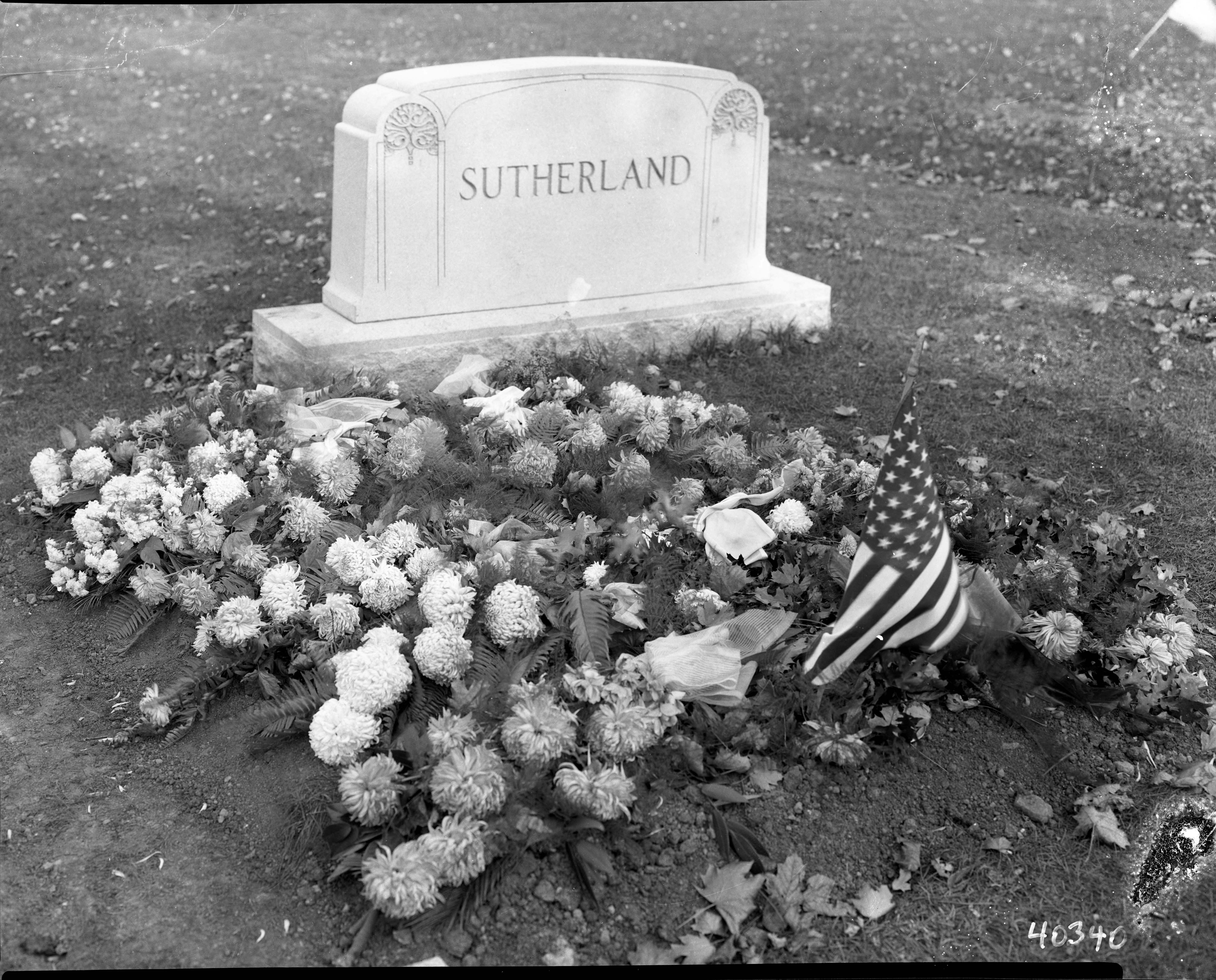 Photograph of a stone cemetery marker with the name, "Sutherland", engraved on it.