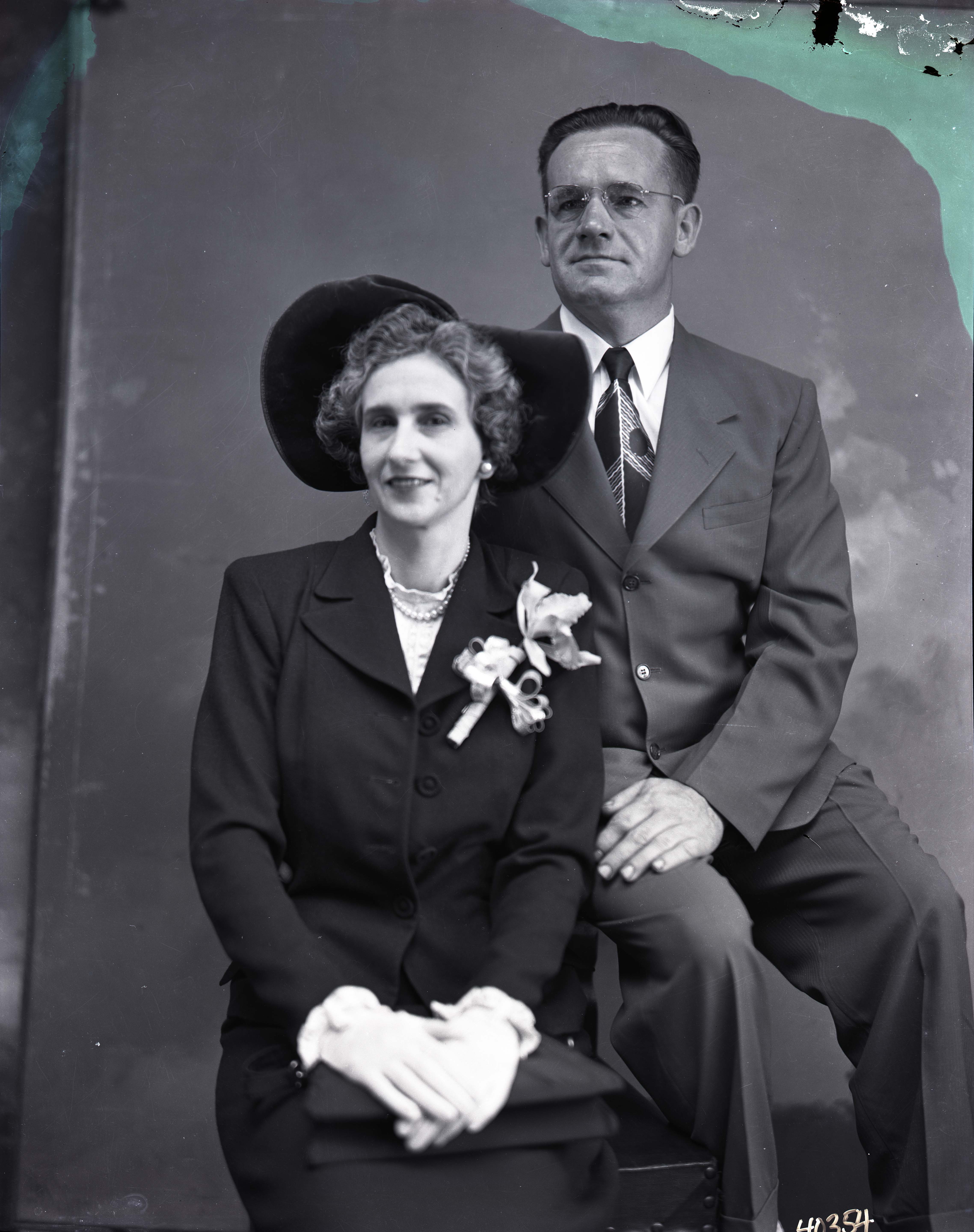 Photograph of Otis Cletus Hyde with glasses posed on the arm of a chair beside his wife, Ollie Mae (Fitzwater) Hyde who is wearing a hat and corsage.