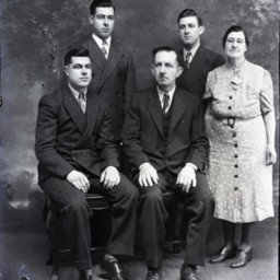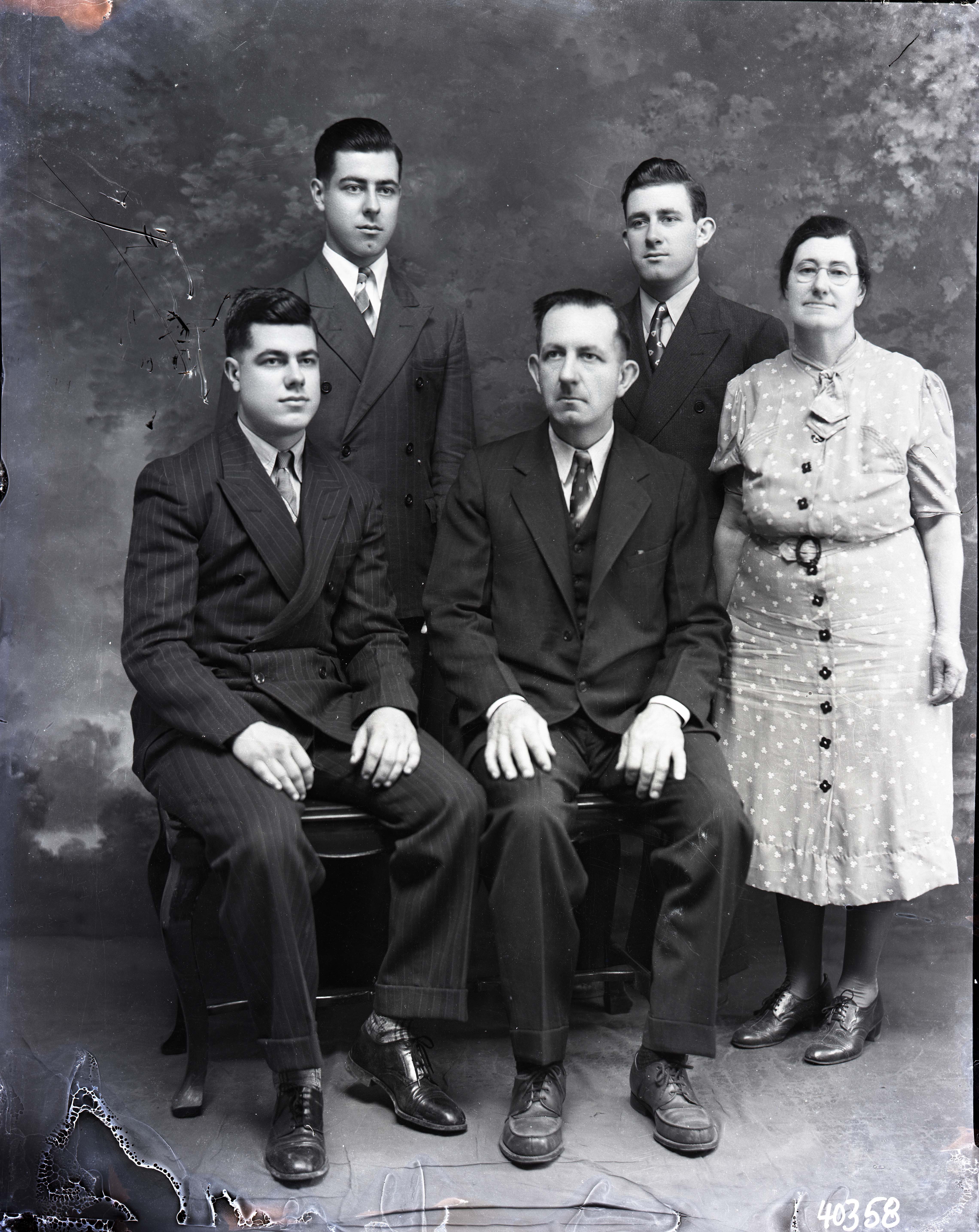 Unidentified man, seated on right, and unidentified woman with glasses, are shown with three grown young men.