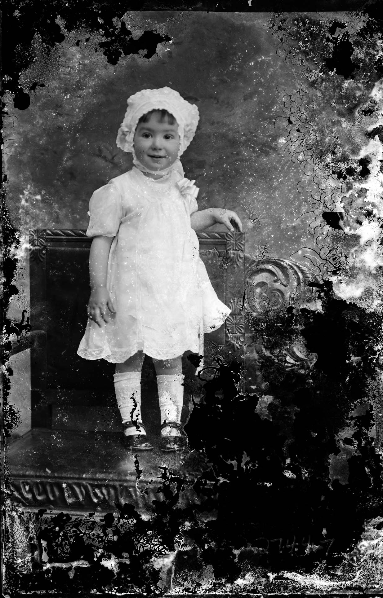 Unidentified young child in a bonnet is standing on a chair.