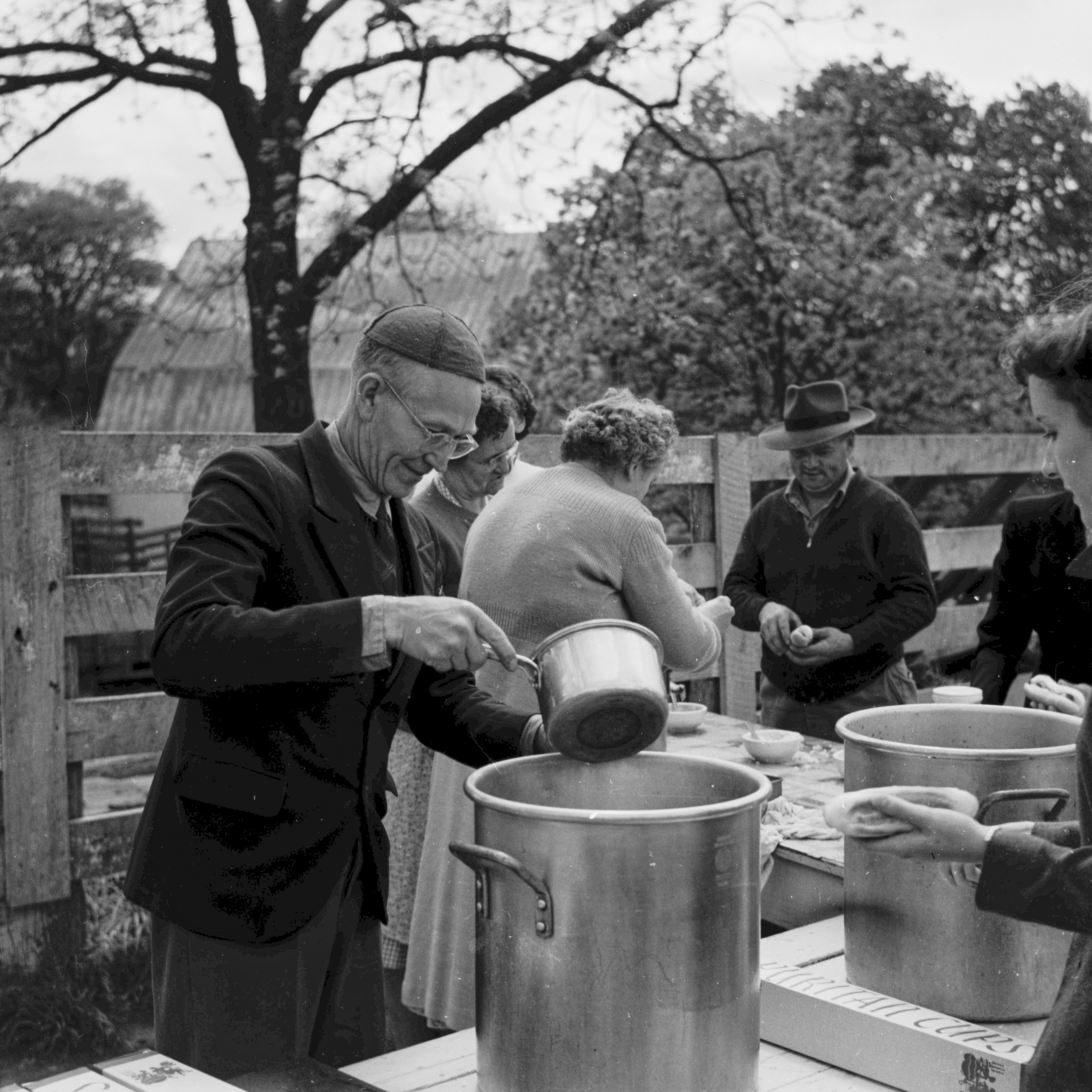 Photograph of Triplett School teacher, Roy Lutz, serving food at the Triplett School May Day celebration on May 13, 1952.