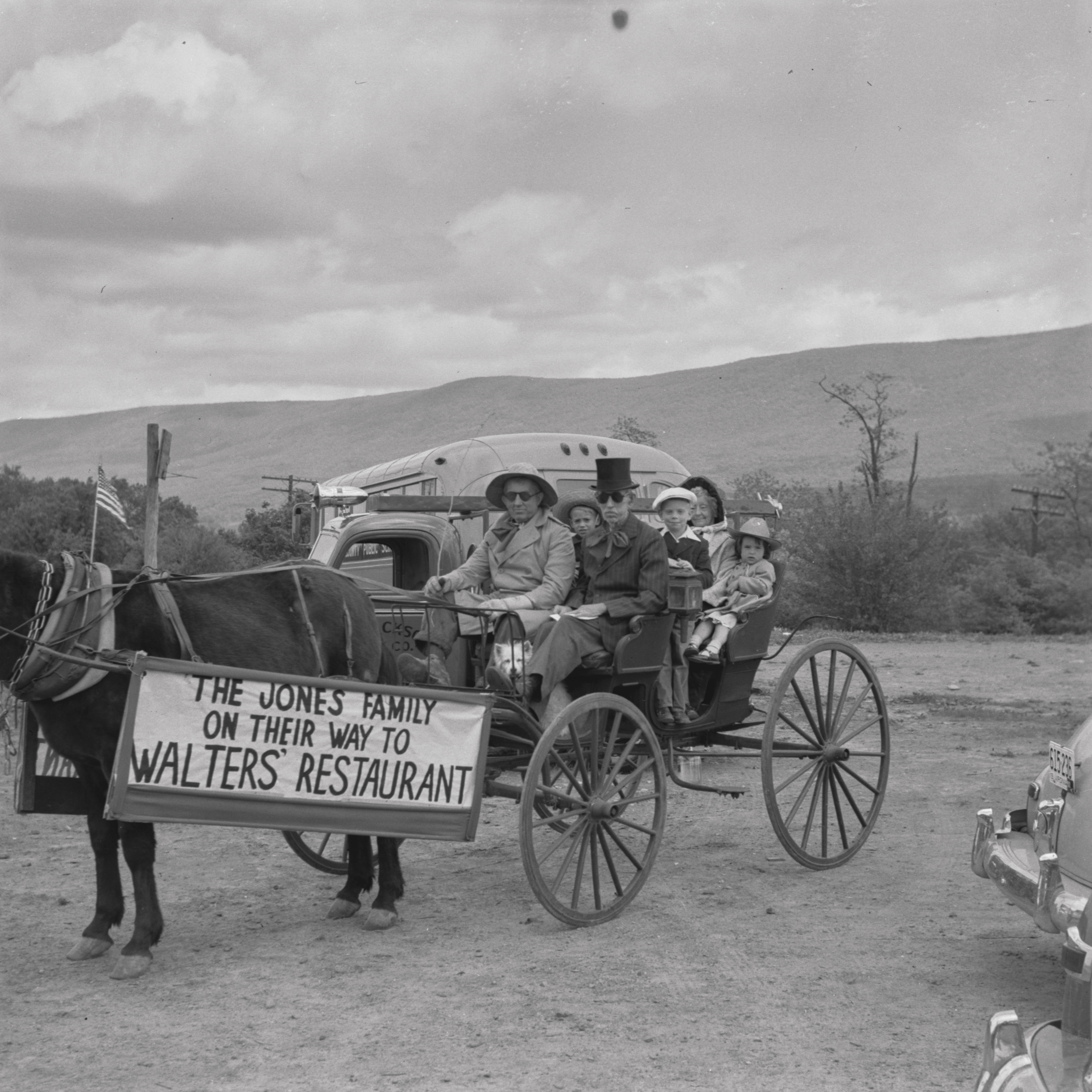 May Day 1952 parade entrant for Walters Restaurant. "Pop" Walters is wearing top hat.