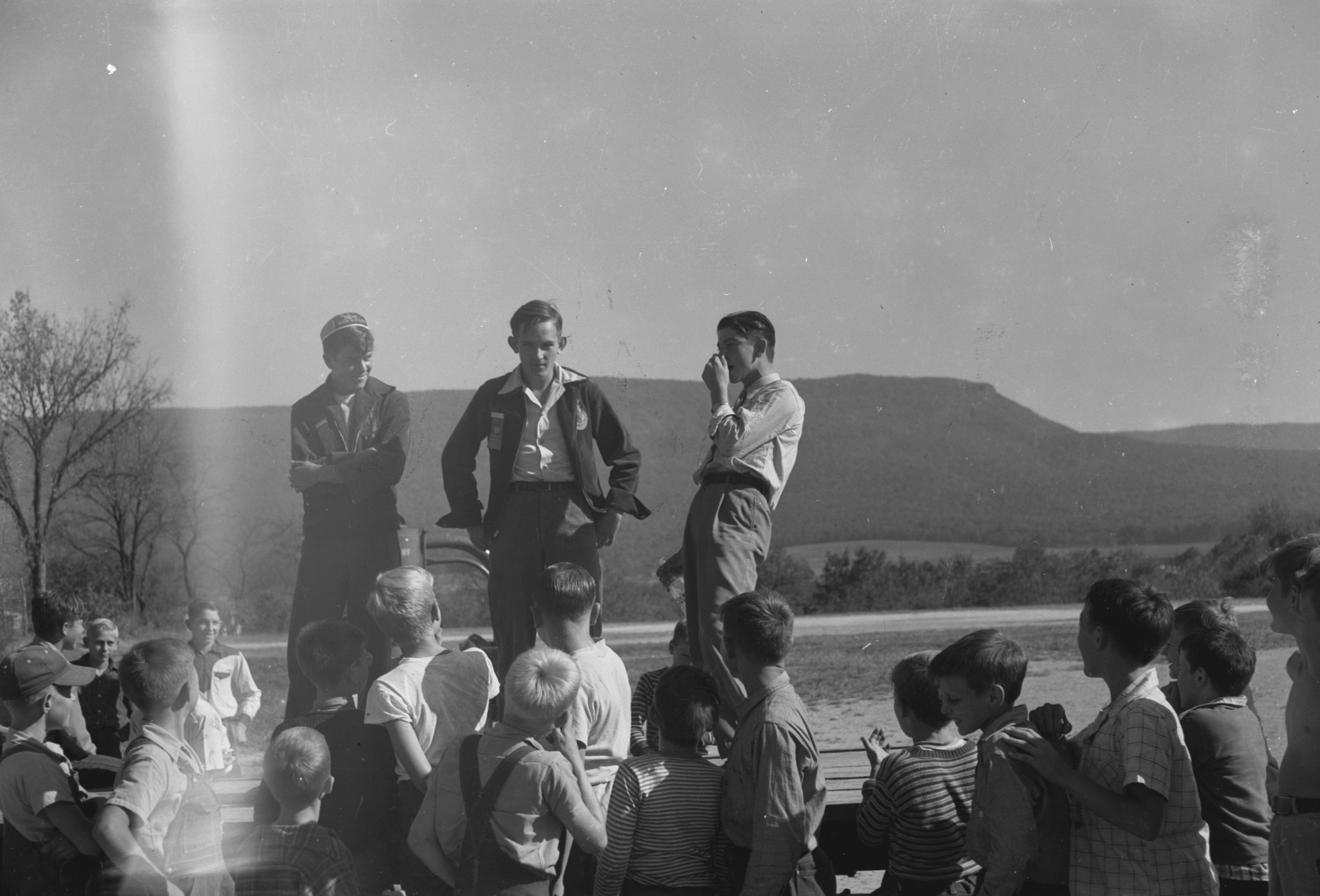 Photograph of Danny Proctor (middle) and Eddy Estep (right) at the Triplett School Fair taken on October 19-20, 1950.