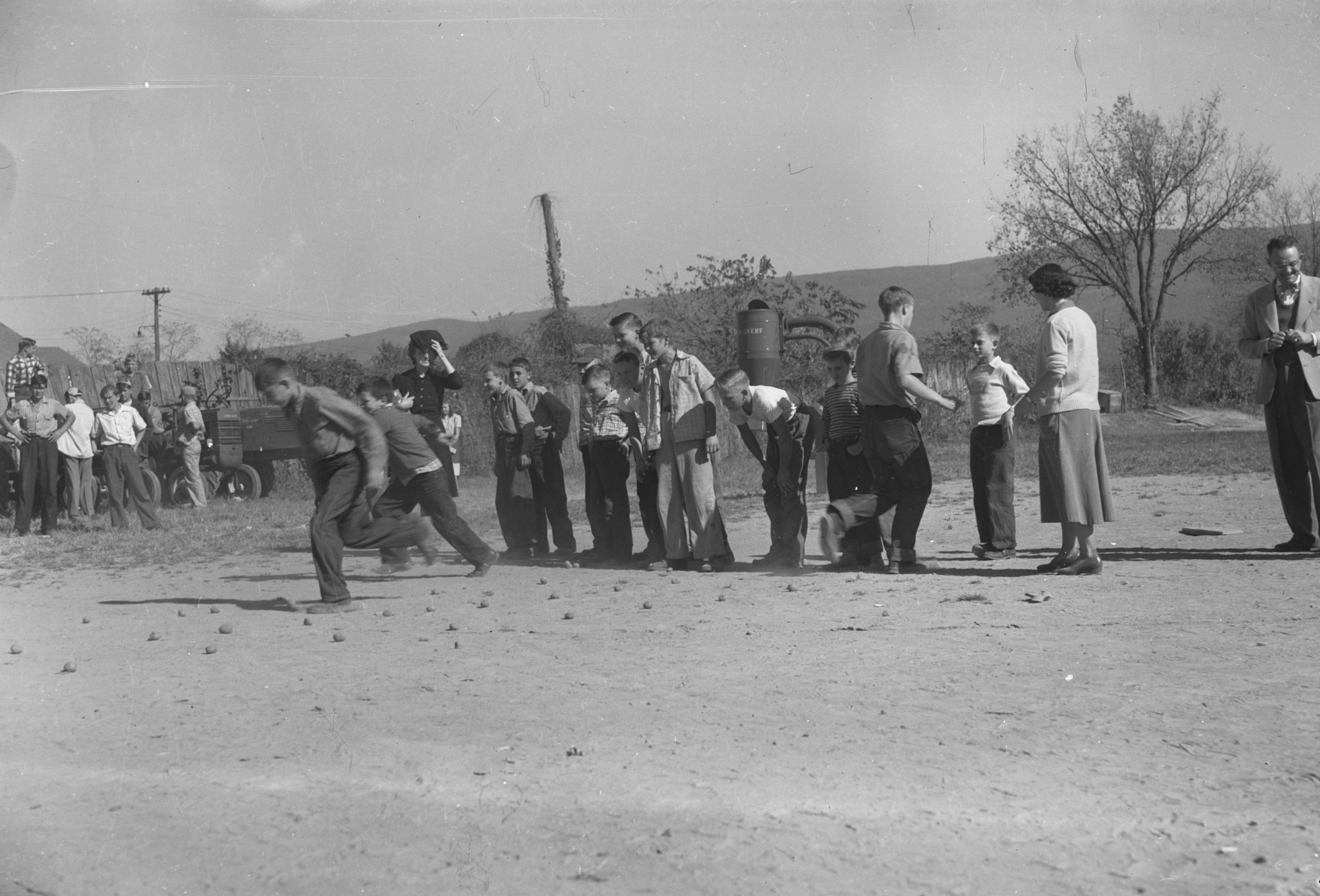 Photograph of participants at the Triplett School Fair taken on October 19-20, 1950. Pictured on the right wearing a coat, tie, and glasses is Triplett agriculture teacher Lawrence Bowers.