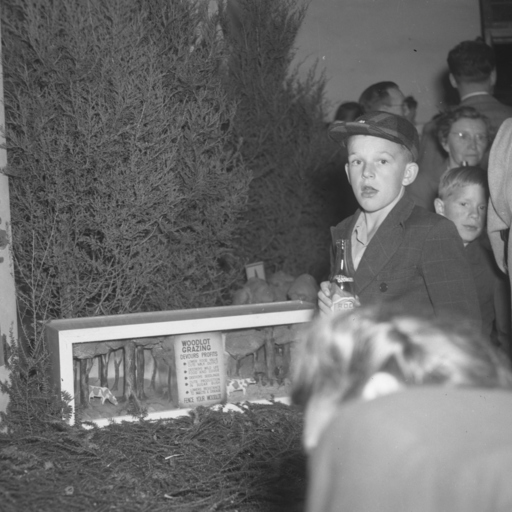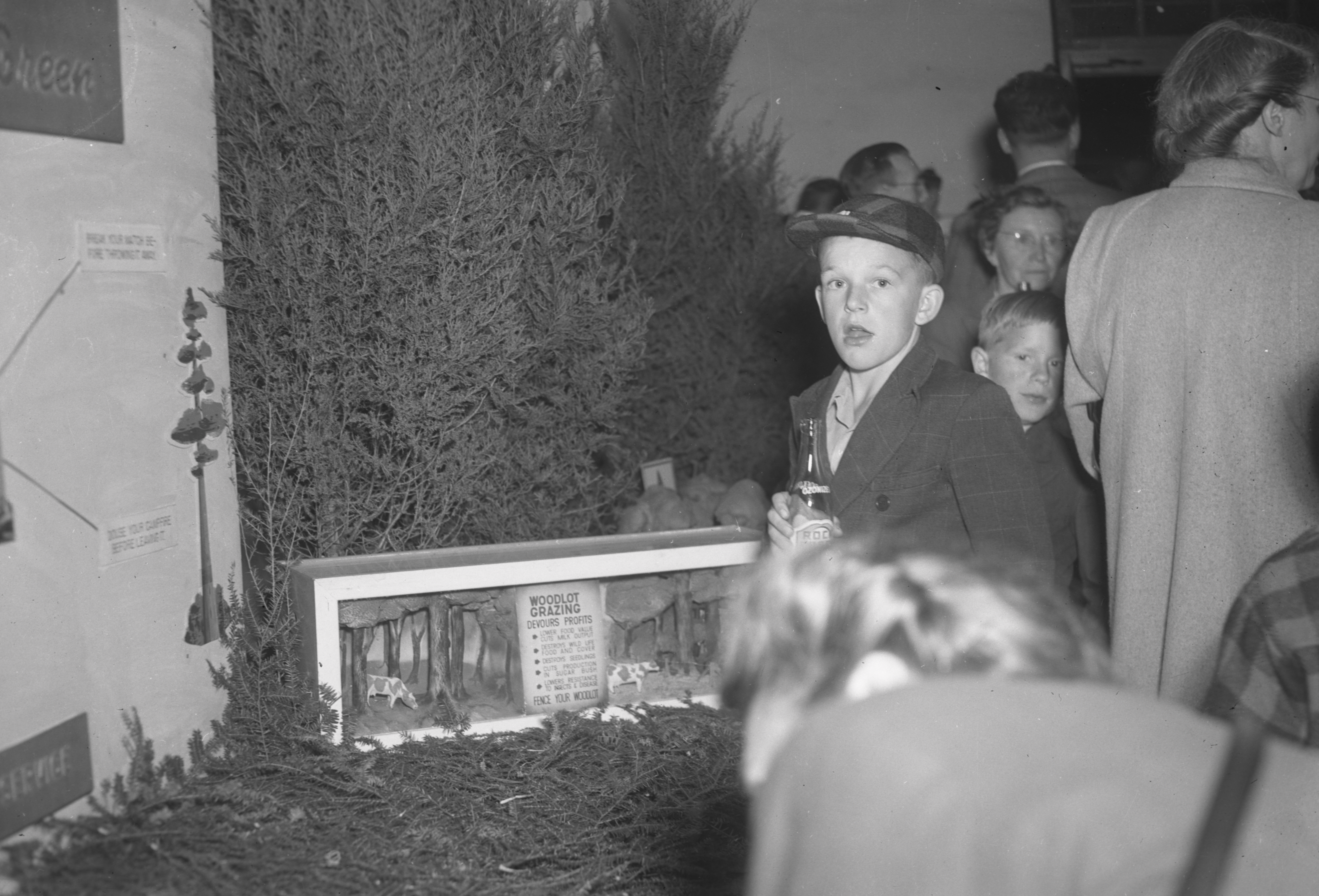 Photograph of a boy in front of a display that says "Woodlot Grazing Devours Profits" taken at the Triplett School Fair on October 19-20, 1950.