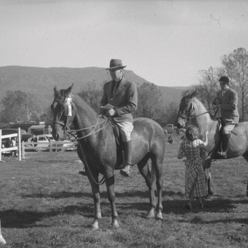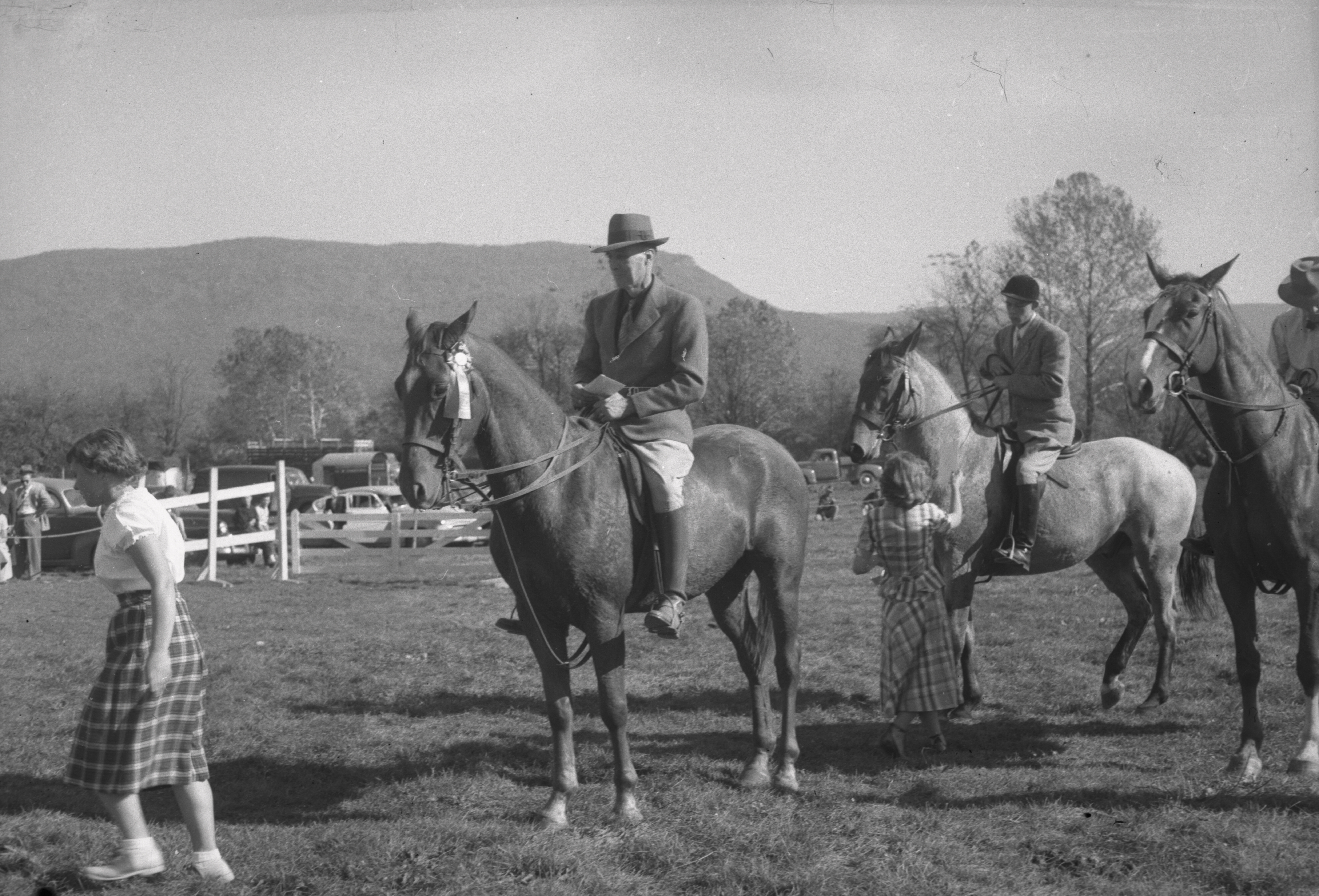 Photograph of participants on horses at the Triplett School Fair taken on October 19-20, 1950. Fred Ziegler is pictured riding the middle horse.