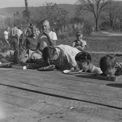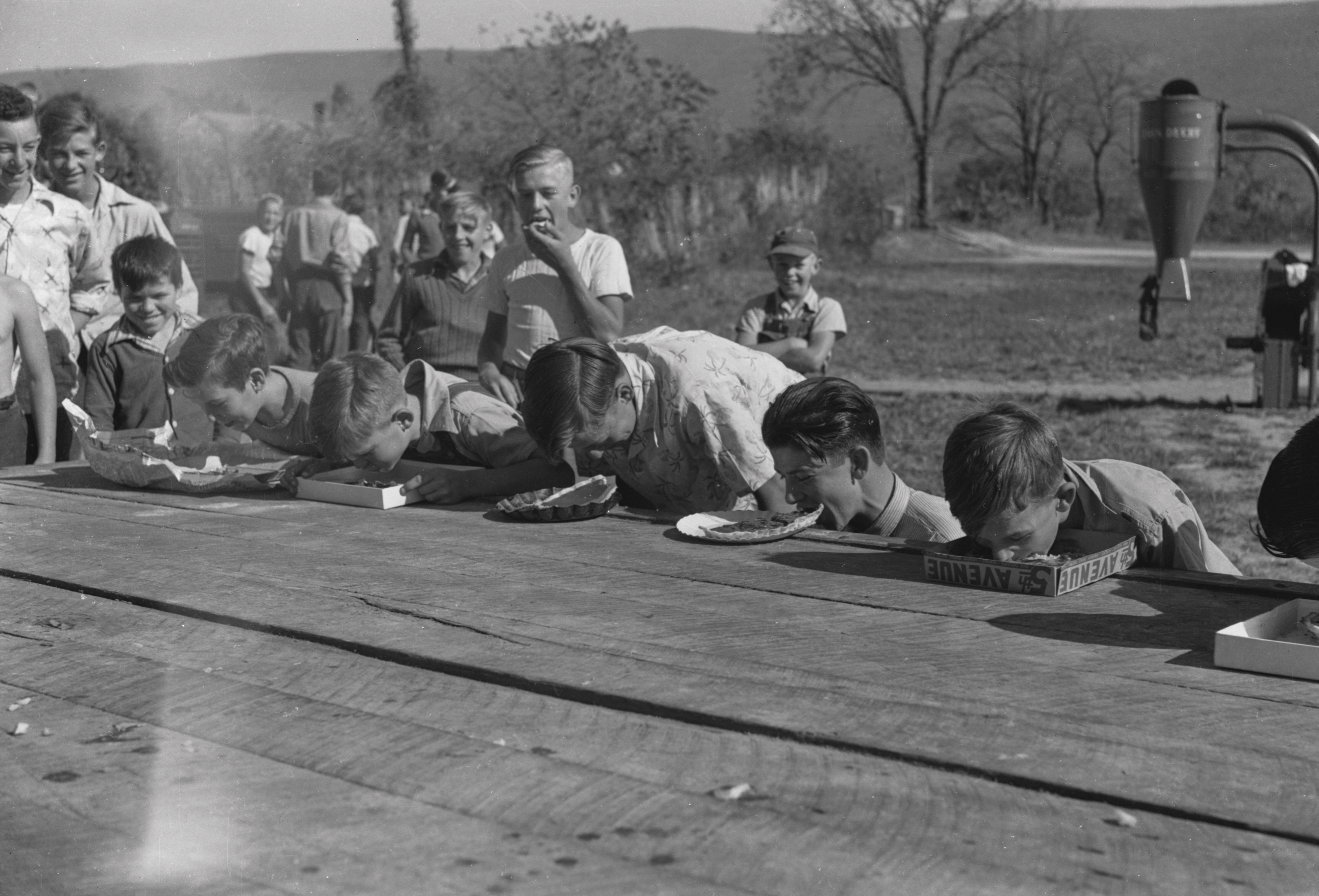 Photograph of an eating competition at the Triplett School Fair taken on October 19-20, 1950.