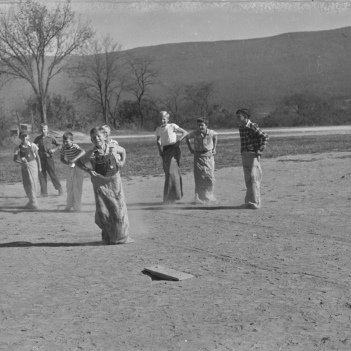 Photograph of a sack race at the Triplett School Fair taken on October 19-20, 1950.