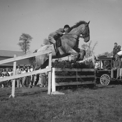 Photograph of Fred Sigler on a horse making the jump at the Triplett School Fair taken on October 19-20, 1950.